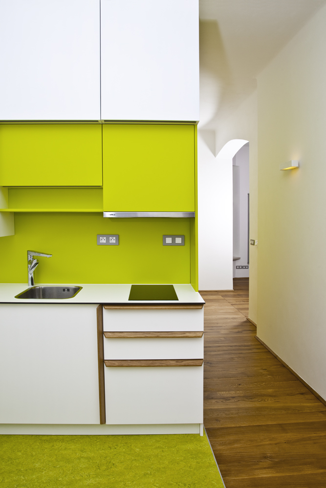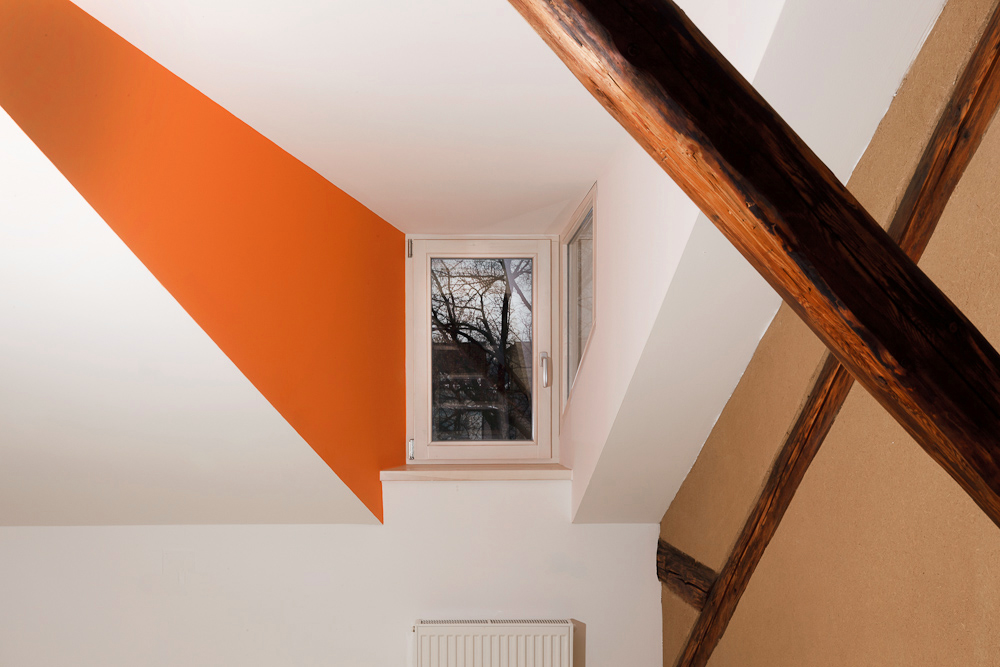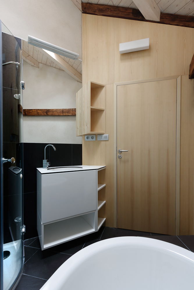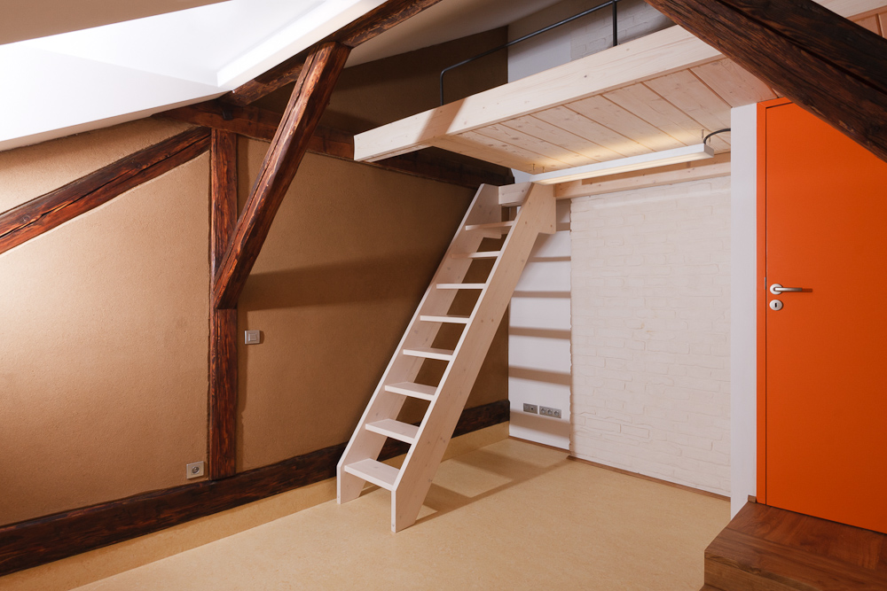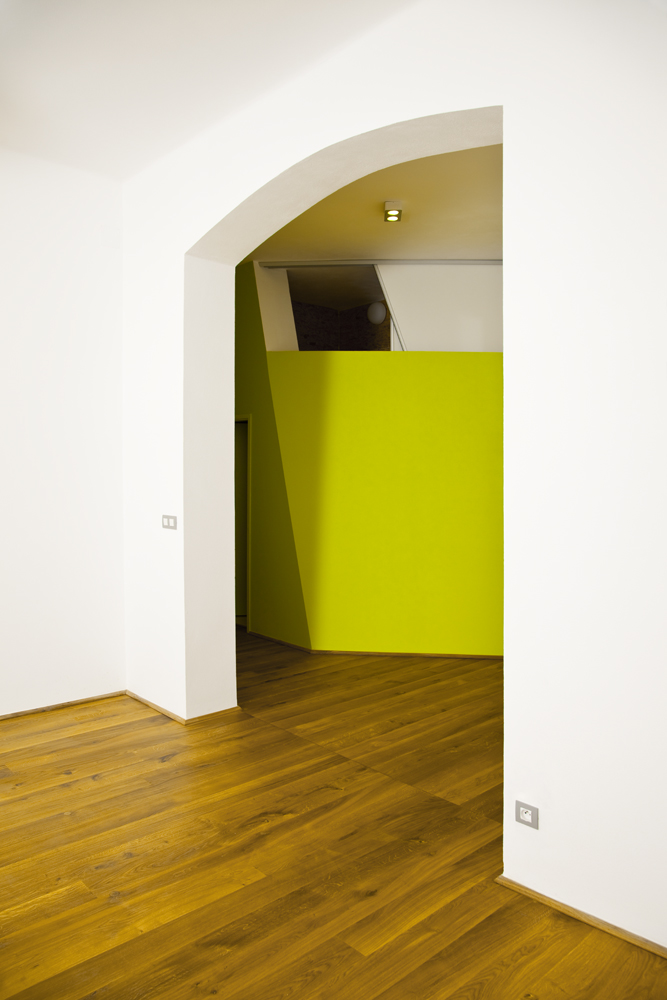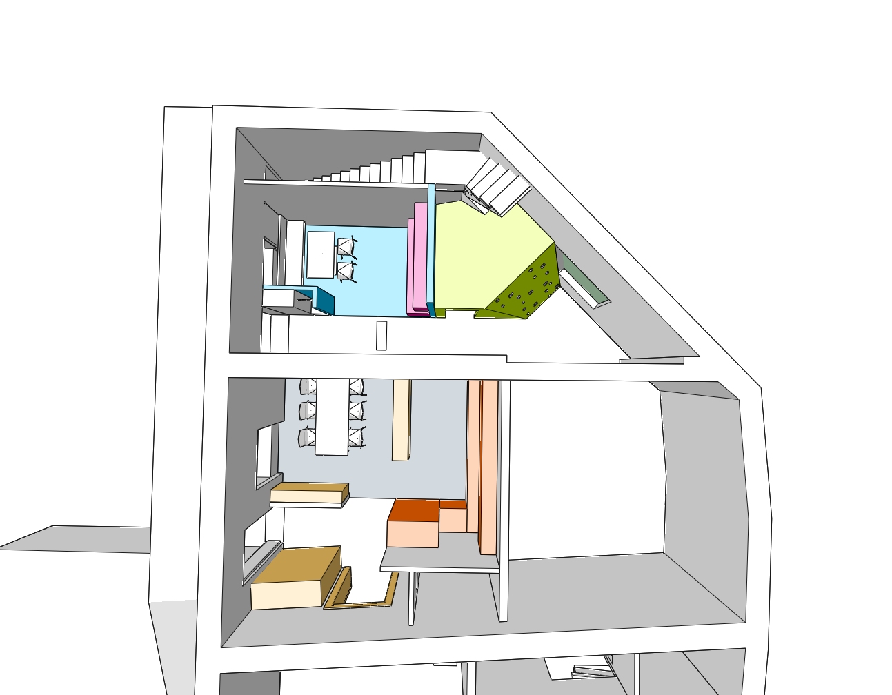 Lomený obrys domu a dlouhé schodiště do podkrovního bytu ohraničují prostor, kde ve zbývající části půdorysu patra vznikl malý jednoprostorový byt. Dispozice založená na soustředění šatny, jídelny, kuchyně a koupelny do bloku u vstupu uvolňuje zbylé plochy bytu, vzniklá vestavba je pak od původního bytu oddělena výškově a barevně. Vysoká světlá výška nabízela vložit nad koupelnu spací patro pro návštěvy, ale kvůli technickým a statickým úpravám zde nakonec vznikl pouze úložný prostor. Zešikmením stěny koupelny se prostor směrem nahoru více otevírá, nepůsobí stísněně a skrz nový otvor velkoryseji prosvětluje hloubku dispozice. Nakloněná rovina umožnila instalaci žebříku nebo lezeckých chytů pro lepší dostupnost úložného prostoru.
