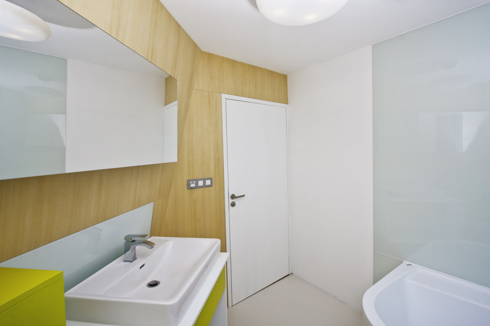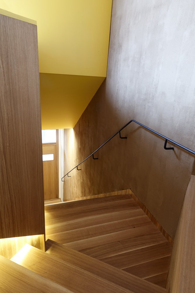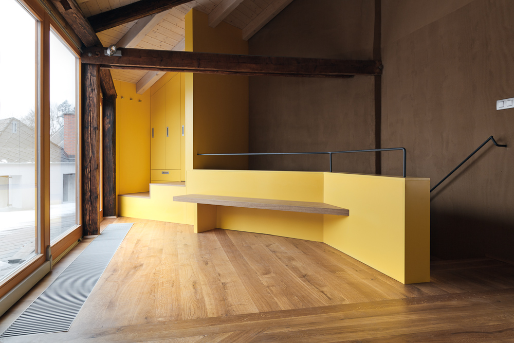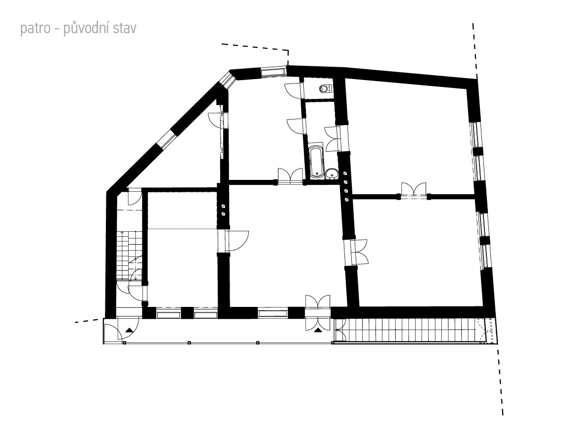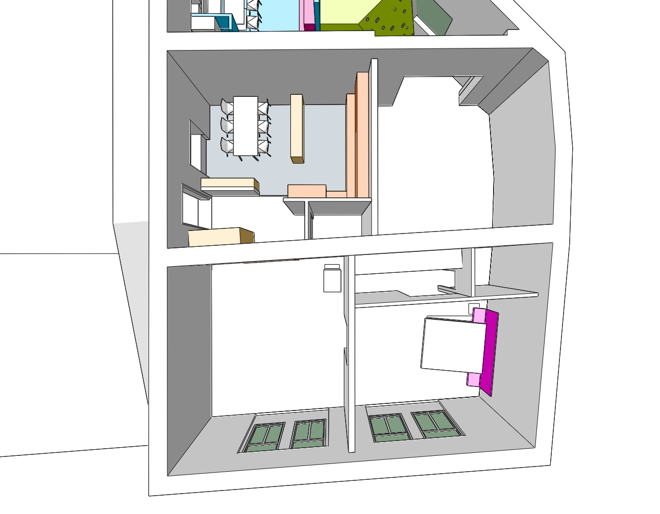Lomený obrys domu a dlouhé schodiště do podkrovního bytu ohraničují prostor, kde ve zbývající části půdorysu patra vznikl malý jednoprostorový byt. Dispozice založená na soustředění šatny, jídelny, kuchyně a koupelny do bloku u vstupu uvolňuje zbylé plochy bytu, vzniklá vestavba je pak od původního bytu oddělena výškově a barevně. Vysoká světlá výška nabízela vložit nad koupelnu spací patro pro návštěvy, ale kvůli technickým a statickým úpravám zde nakonec vznikl pouze úložný prostor. Zešikmením stěny koupelny se prostor směrem nahoru více otevírá, nepůsobí stísněně a skrz nový otvor velkoryseji prosvětluje hloubku dispozice. Nakloněná rovina umožnila instalaci žebříku nebo lezeckých chytů pro lepší dostupnost úložného prostoru.