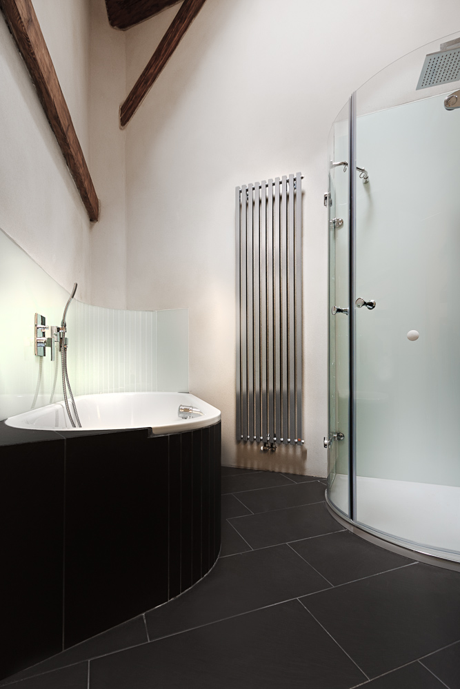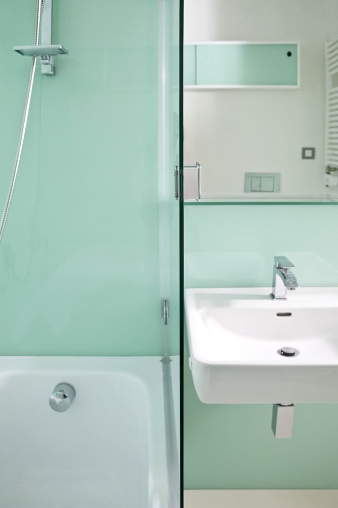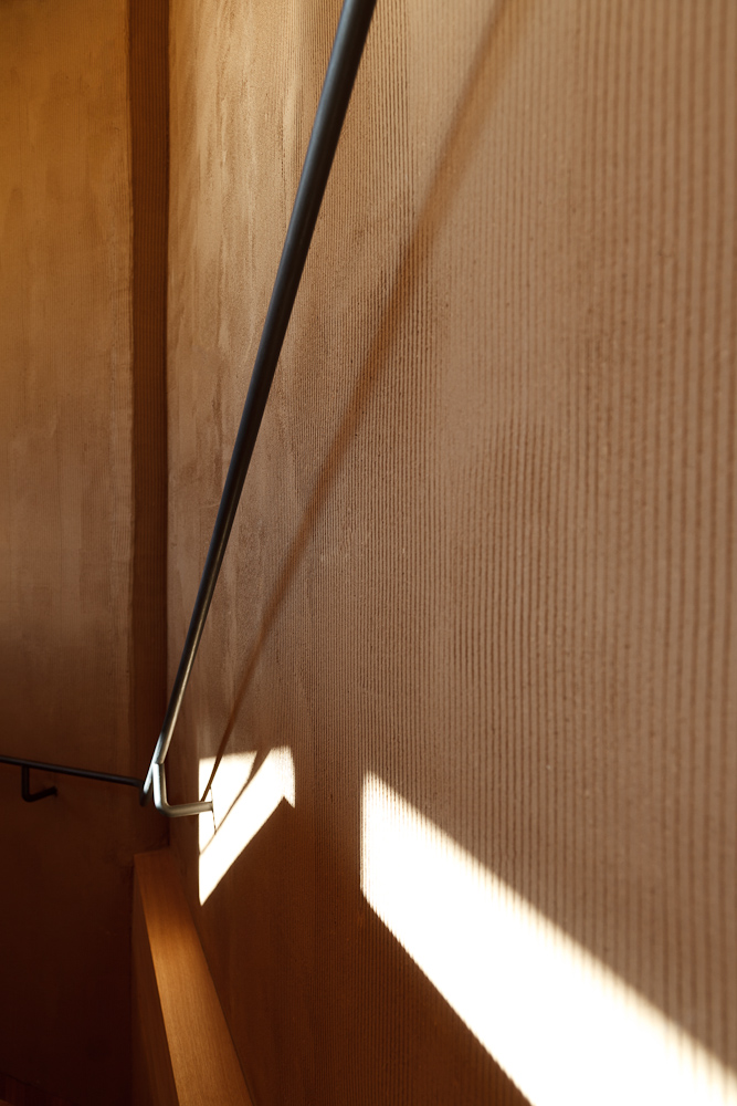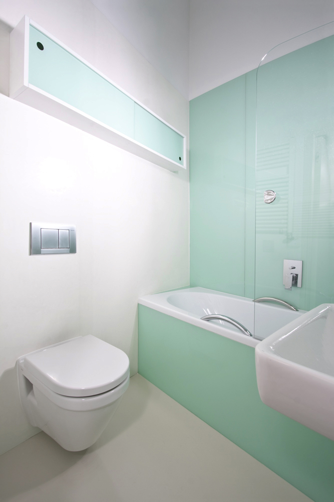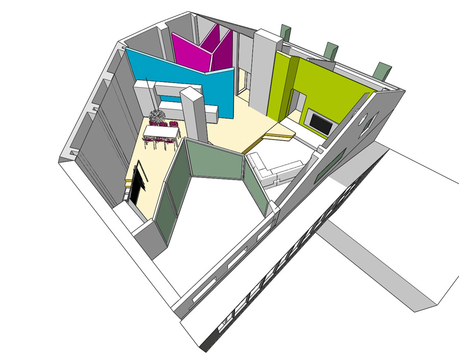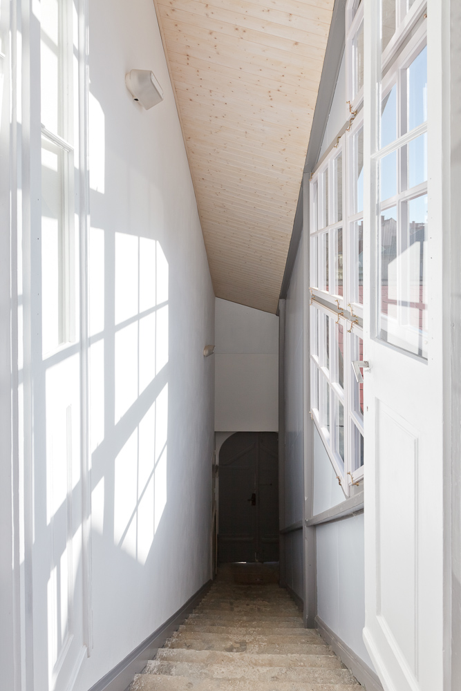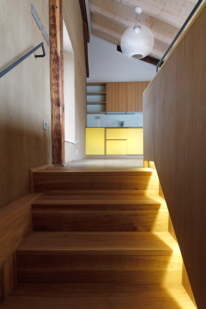 Lomený obrys domu a dlouhé schodiště do podkrovního bytu ohraničují prostor, kde ve zbývající části půdorysu patra vznikl malý jednoprostorový byt. Dispozice založená na soustředění šatny, jídelny, kuchyně a koupelny do bloku u vstupu uvolňuje zbylé plochy bytu, vzniklá vestavba je pak od původního bytu oddělena výškově a barevně. Vysoká světlá výška nabízela vložit nad koupelnu spací patro pro návštěvy, ale kvůli technickým a statickým úpravám zde nakonec vznikl pouze úložný prostor. Zešikmením stěny koupelny se prostor směrem nahoru více otevírá, nepůsobí stísněně a skrz nový otvor velkoryseji prosvětluje hloubku dispozice. Nakloněná rovina umožnila instalaci žebříku nebo lezeckých chytů pro lepší dostupnost úložného prostoru.
