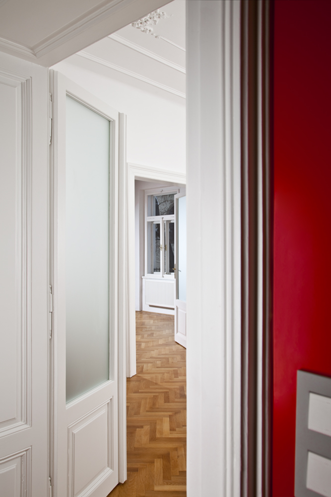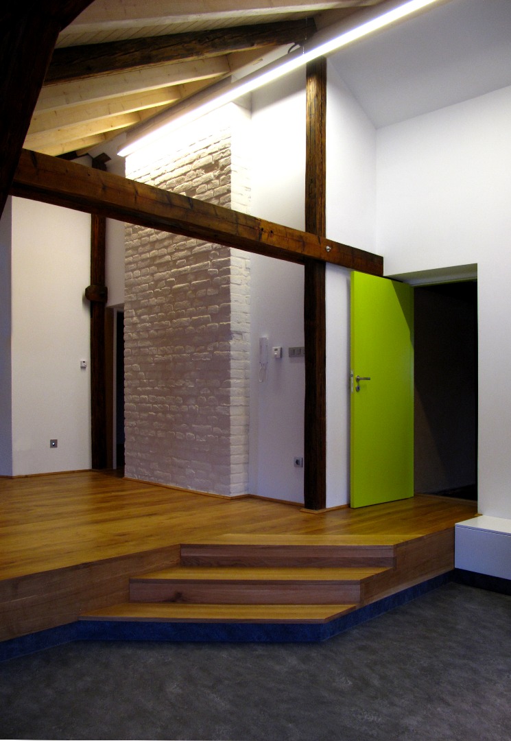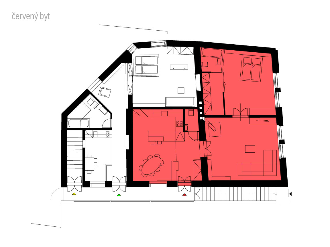 Naším záměrem bylo zachování kvalitních prvků domu a interiéru, doplnit je dle potřeby novými materiály. Nové a původní prvky jsme však důsledně oddělovali. Základem rekonstrukce bylo ponechání a repase stávajících konstrukcí, oken, dveří, podlah a doplnění novými přírodními materiály, jako je hliněná omítka, dřevo, marmoleum. Novým motivem v interiéru se stala barva. Barevný akcent provází všechny tři navržené byty, stal se základem pro jejich pojmenování – červený, zelený a žlutý byt. Komplikované prostorové souvislosti domu si vynutily specifické dispoziční uspořádání. Jádrem každého z nových bytů se stal nábytkový prvek kuchyně a koupelny, vložený do dispozice formou odnímatelné vestavby.