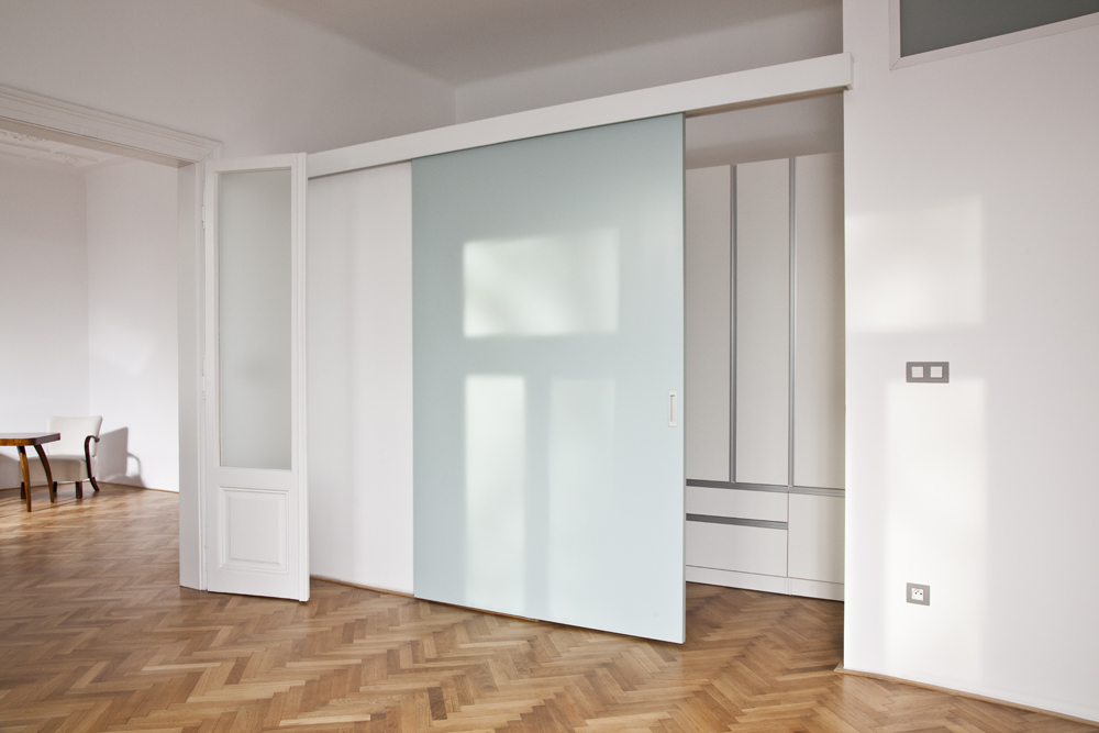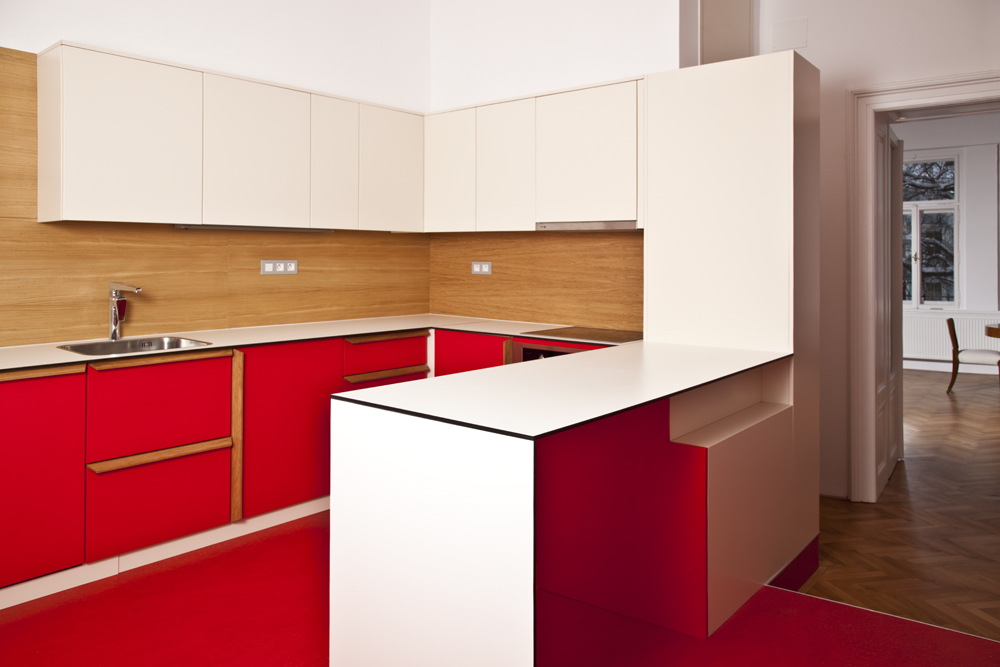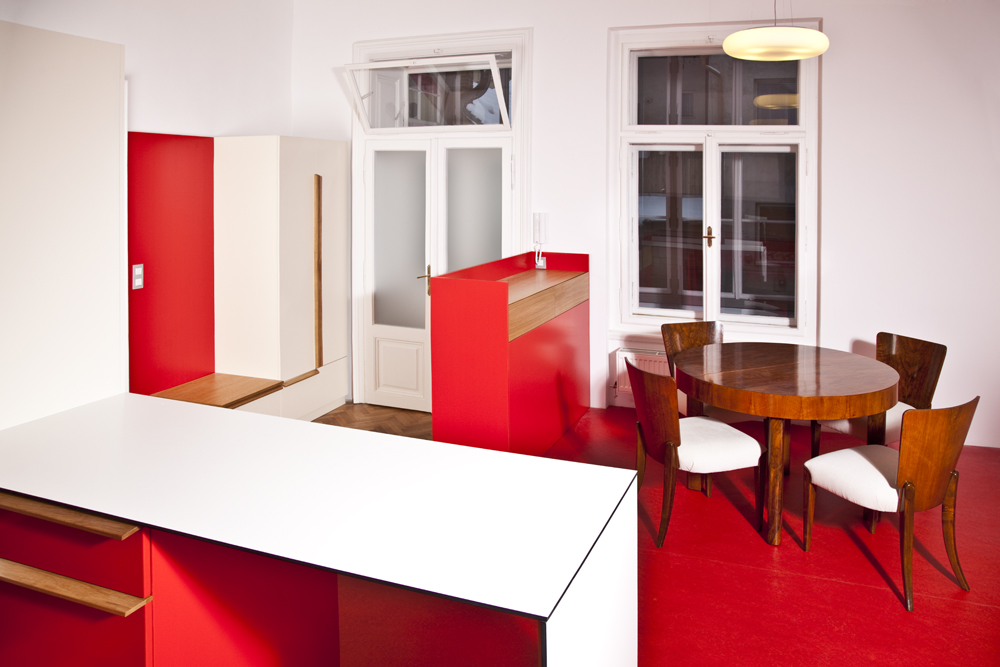 Byt orientovaný do náměstí je určen pro původní obyvatele patra. Zastřešená pavlač plní funkci zádveří a vstup do kuchyně je vymezen šatní skříňí s botníkem. Výrazný tón červené barvy jsme použili na podlaze i nábytku. Na původní parketovou podlahu bylo v části místnosti osazeno pódium s kuchyňskou linkou a jídelním koutem.. Do ložnice byla vložena šatna s velkou posuvnou stěnou, přes níž se vstupuje do malé koupelny s velkým nadsvětlíkem. Okna do náměstí byla repasována včetně dobového mosazného kování, stejně jako zárubně, dveře, původní nábytek a svítidla.