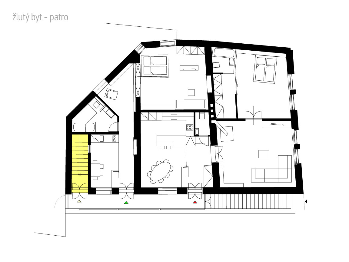 V průběhu realizace se investorovi podařilo odkoupit sousední dům, což umožnilo umístění oken do dvora ve žlutém a zeleném bytě.