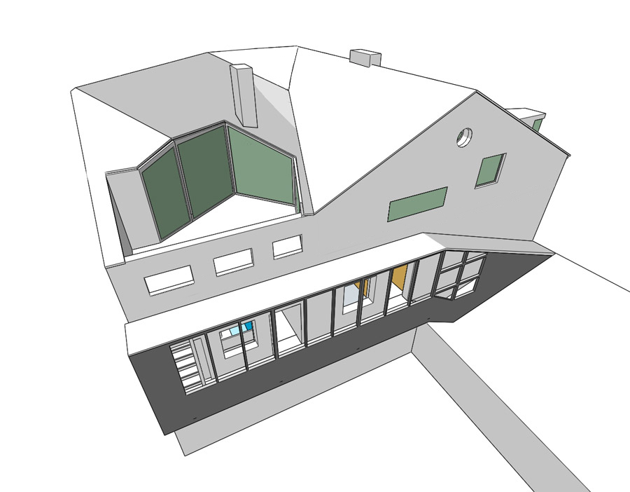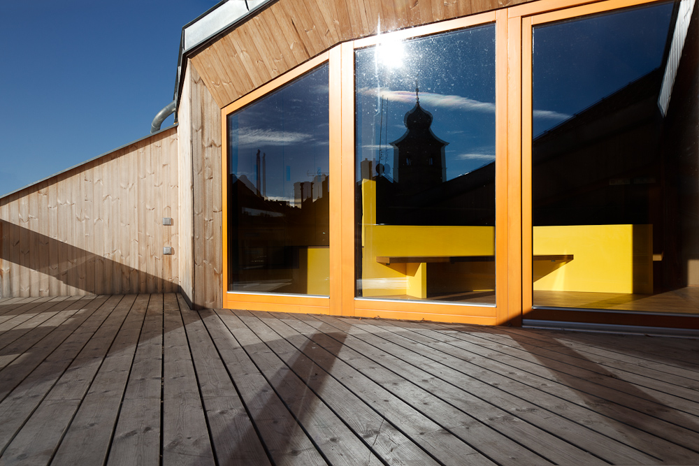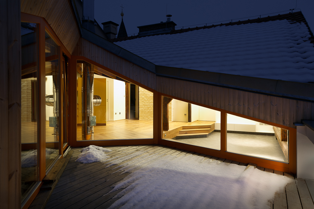 Zářezem do konstrukce střechy v jejím nejnižším místě vznikla obytná terasa navazující na kuchyni a hlavní obytný prostor v interiéru. Rozhraní exteriéru a interiéru je tvořeno prosklenou stěnou, která prosvětluje interiér a zároveň vytváří optické rozšíření obytných prostor interiéru do exteriéru. Pevnou, záchytnou hranici na terase tvoří původní obvodová stěna, která zůstala zachována. Na jednotlivých prosklených plochách (polygon prosklení terasy, světlíky) dochází k odrazům okolního prostředí. Díky tomuto efektu se přes jednotlivé odrazy do interiéru dostává například věž kostela. Spojení města a obyvatel bytu napomáhá pásové okno, jehož nízký parapet umožňuje výhled na panorama města z pohodlí sedačky.