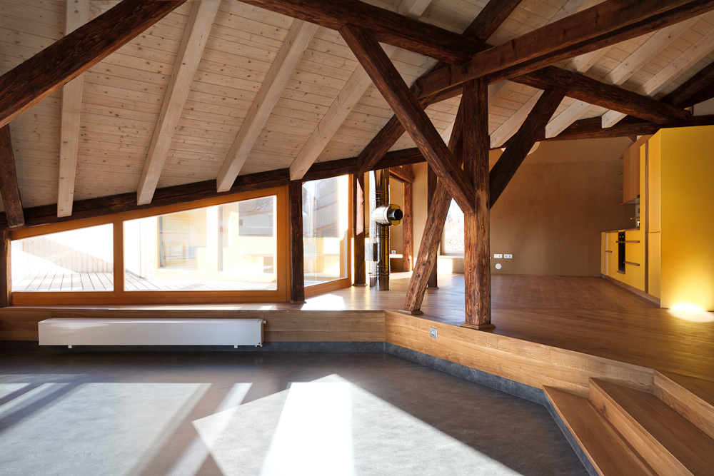 Princip důsledného odlišení nových a původních prvků se výrazně uplatňuje v konstrukci krovu, kde zůstali zachované původní dřevěné prvky, doplněné novými krokvemi s bílou lazurou. Původní záměr, zachovat vazné trámy přiznané v nášlapné vrstvě podlahy, byl změněn z důvodu průhybu trámu. Tyto trámy se tedy do podlahy pouze přepsaly, a jednotlivá dřevěná prkna k nim dobíhající se otáčejí dle převažujícího směru nosných trámů. Původní konstrukce zůstala zachována v přepisu na vnější povrch. Na lomené obvodové stěně, v koupelně a příčkách mezi pokoji byla pro zlepšení mikroklimatu použita hliněná omítka s přídavkem řezanky a sušené levandule.