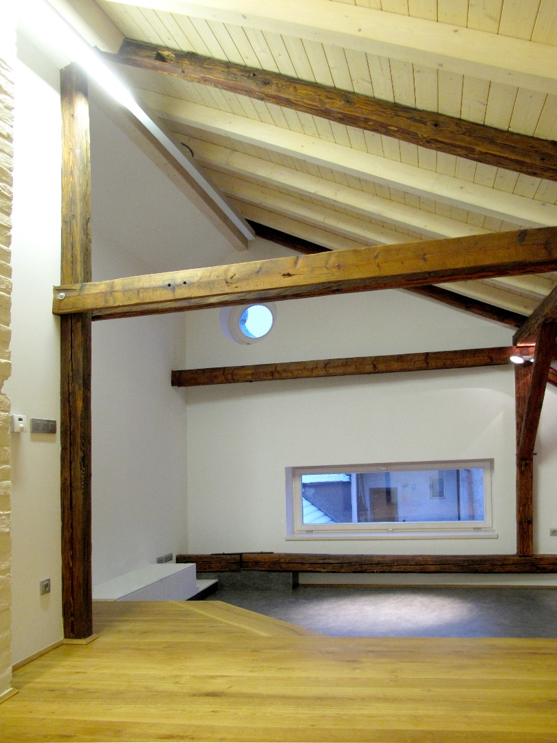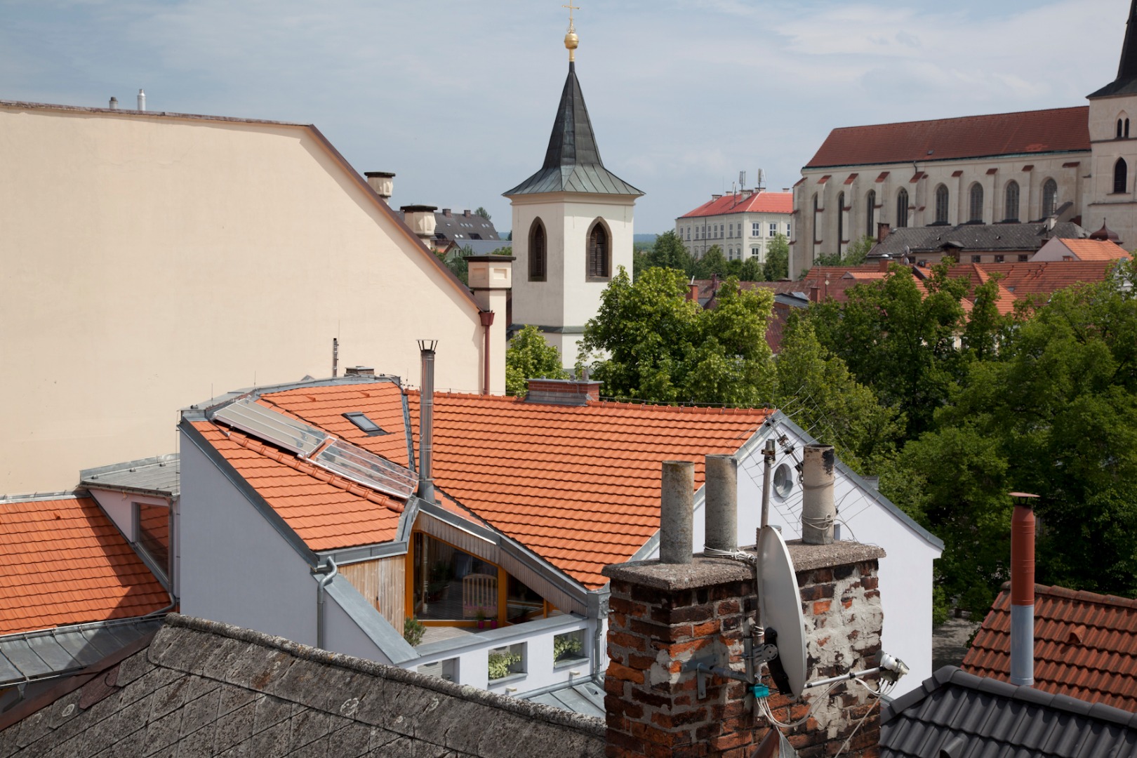 Byt vestavěný do podkroví nabízí největší užitnou plochu. Dispoziční řešení vychází z nepravidelné konstrukce střechy, jejíž většina zůstala zachována. Vysoká výška krovu dovolila položení podlahy na horní úroveň vazných trámů, zároveň umožnila hru výškových úrovní, takto vzniklý hlavní obytný prostor se dostal o tři stupně níž než kuchyně. Na východní straně, jsou směrem k náměstí orientovány tři pokoje, jejichž vstupy navazují na vyšší úroveň podlahy v kuchyni. K vyrovnání úrovní dochází uvnitř místností, kde se opět hlavní podlaha nachází o tři schodišťové stupně níž. Vyšší světlá výška umožnila rovněž vložení spacího patra do jednoho z pokojů. Prosvětlení pokojů přirozeným světlem je řešeno pultovými světlíky. Jejich prosklení „přes roh“ umožňuje nejen výhled východním směrem na náměstí a radniční věž, ale zároveň přístup jižního světla do interiéru. Stěna světlíku, na niž dopadá jižní světlo je šikmá a má v každém pokoji jinou barvu – žlutá, zelená, oranžová. Takto je dosaženo nejen prosvětlení, ale i probarvení interiéru skrze odražené světlo. Opačného efektu je docíleno večer, kdy jsou pokoje rozsvíceny, venkovní prostor zahalen do tmy a vikýře se tak stávají barevnými zářiči.