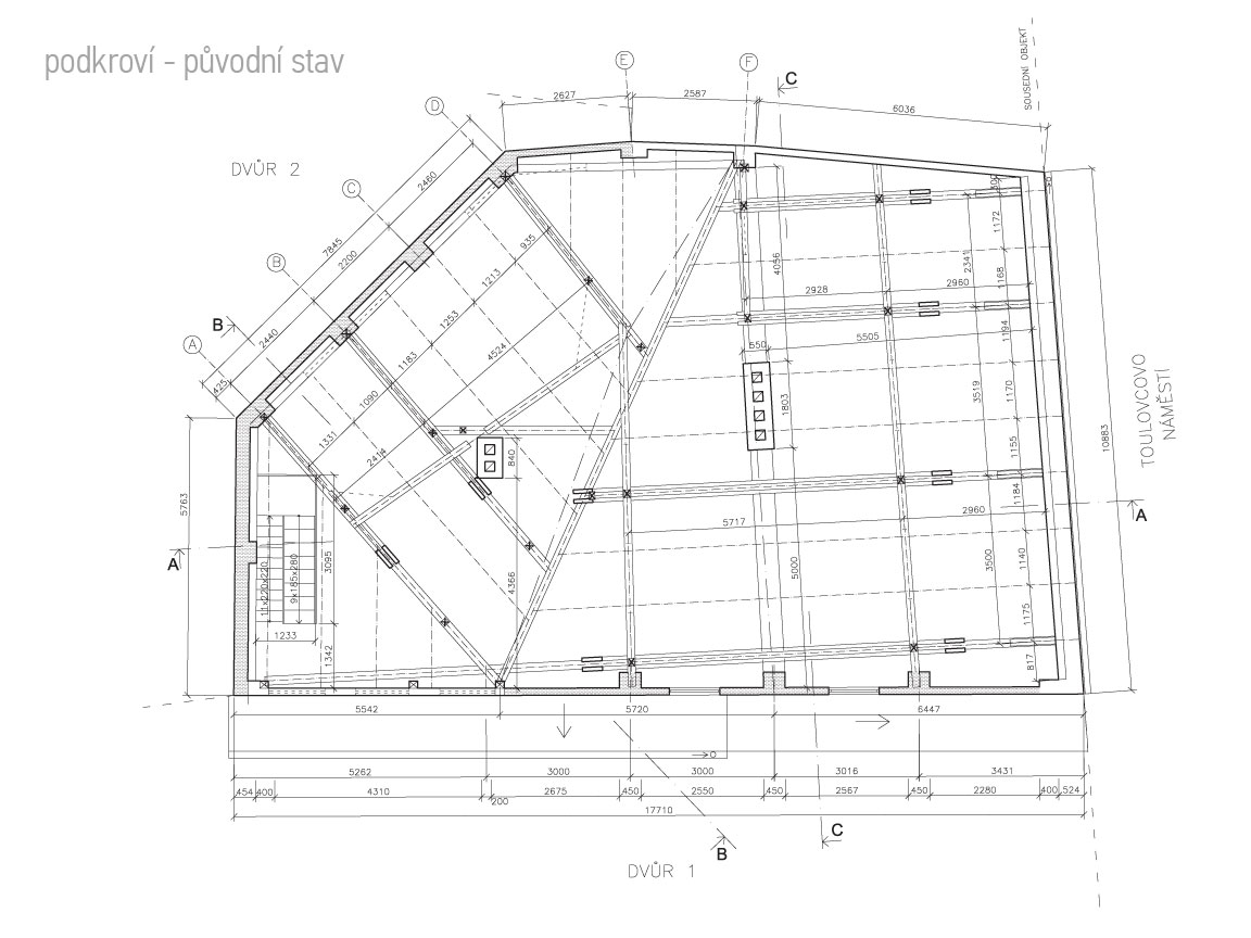 Konstrukce krovu zůstala z velké části zachována, dožilá keramická střešní krytina byla vyměněna. Střešní rovina do ulice byla zvýšena o výšku kontralatí, čímž vznikla odvětrávaná mezera. Tepelná izolace je vložena mezi krokve a pod ně. Střešní roviny orientované do úžlabí mají vyměněné krokve a tepelná izolace je položena na ně. Střecha se v této části zvýšila o cca 250mm.