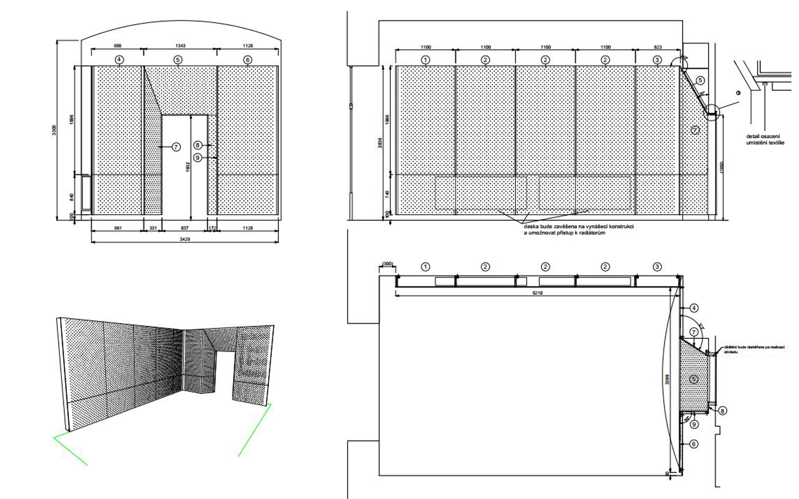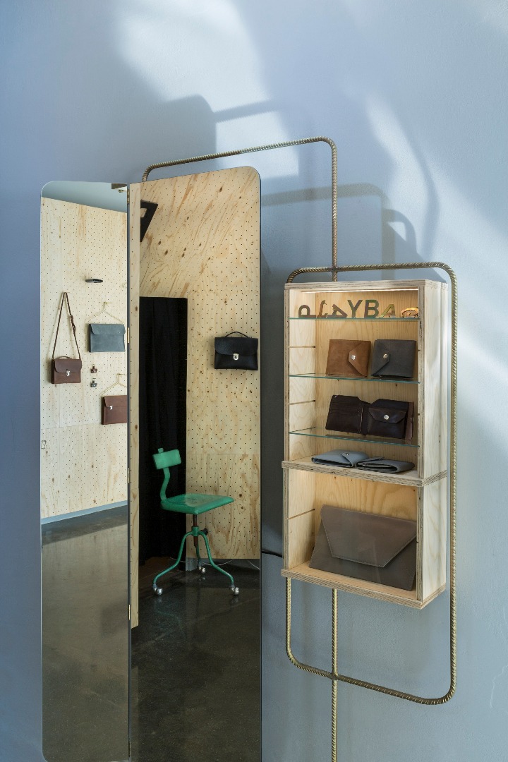 Dalším výrazným prvkem je předsazená stěna obklopující polovinu prostoru. Stěna je vyrobena z perforované nebroušené smrkové překližky, na níž lze jednoduše instalovat produkty, vizuály, stylingové doplňky, systém je flexibilní, umožňuje měnit vystavenou kompozici a přizpůsobovat ji kolekci, která je právě aktuální. V prostoru se nachází mobilní štendr a zrcadlo s vitrínou pro drobnější předměty. Toto vybavení je navrženo jako atypický subtilní objekt, který je vyroben z žebírkové oceli (roxoru) a opatřen galvanickým zinkováním, díky níž mají konstrukce zlatožlutou barevnost. Prvky štendru jsou spojeny koženým páskem a dovolují vytvořit kompaktnější nebo naopak prostorově výraznější stojan. Stabilitu zajišťuje zatížení brusným kamenem, nalezeným v tovární hale zlínského areálu.