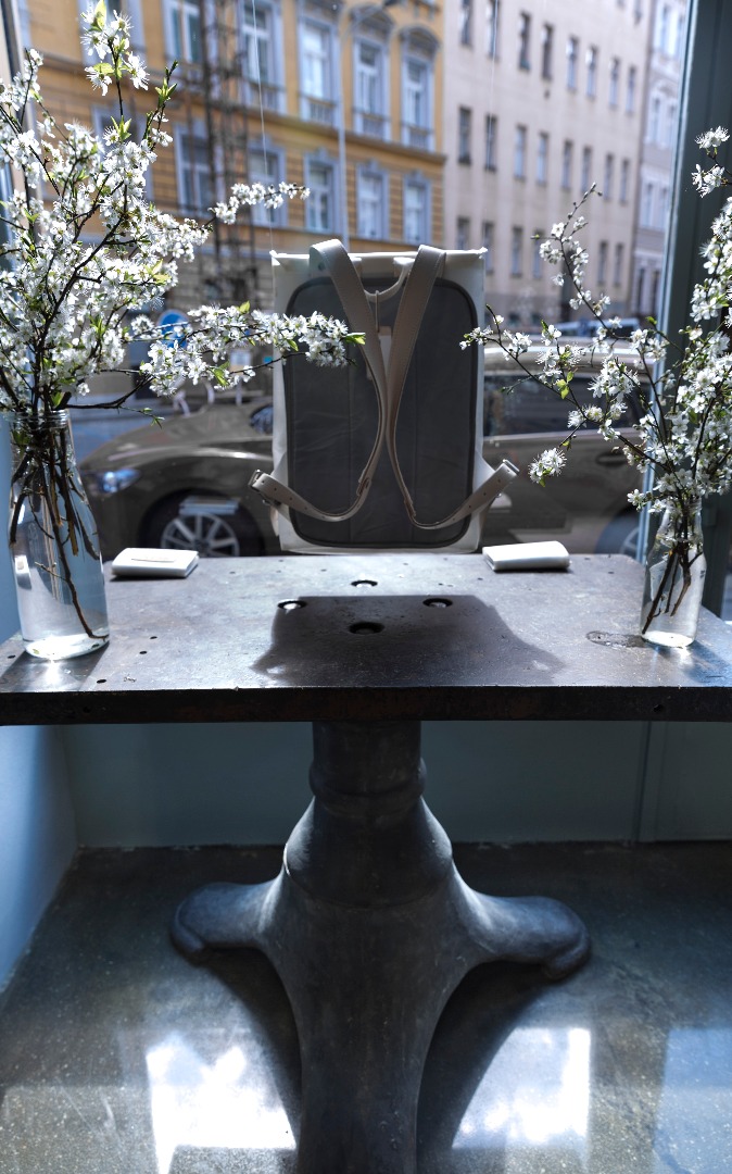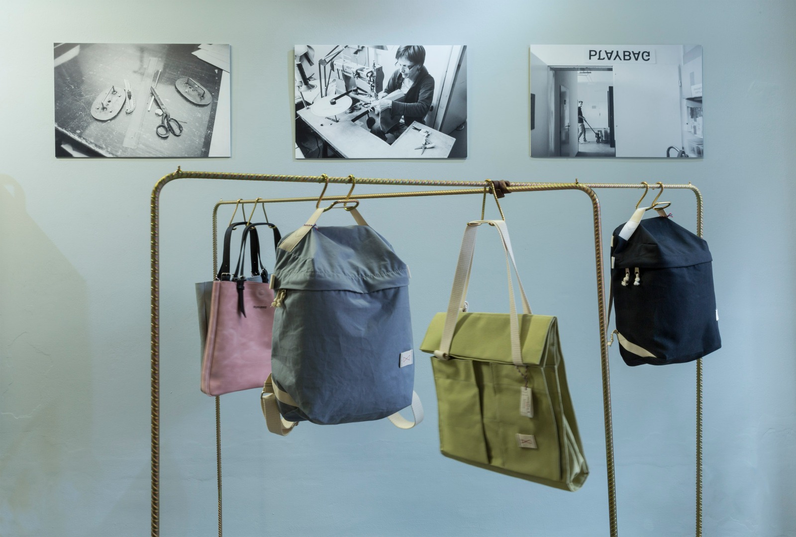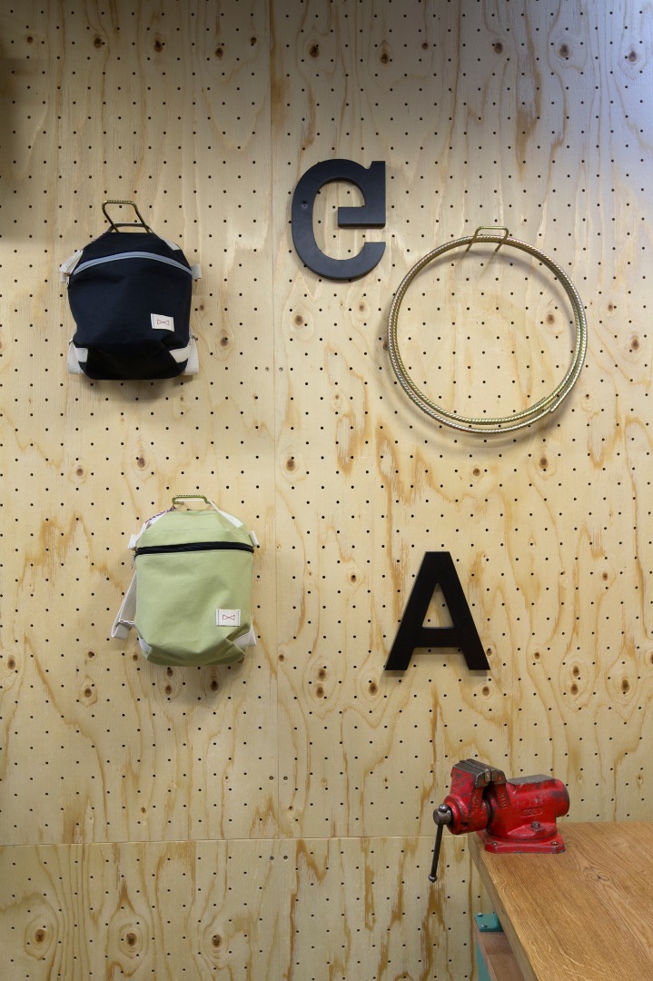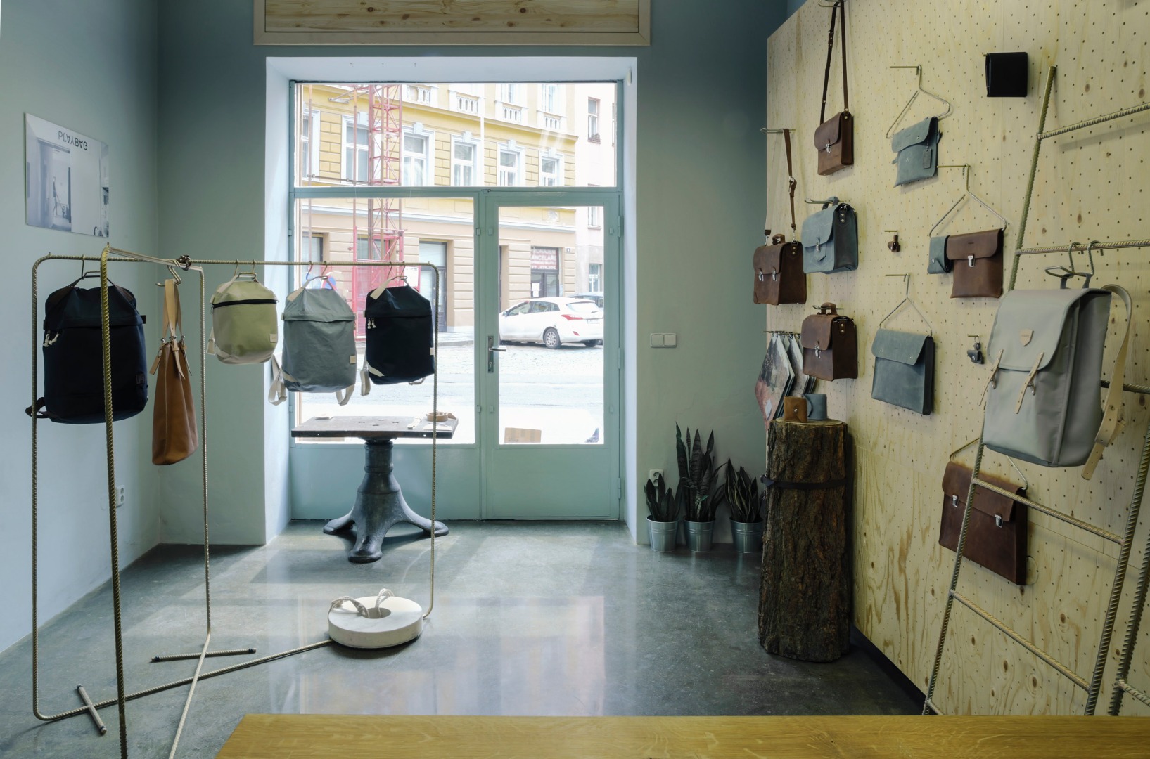 Napříč prostorem lze sledovat kombinace současného se starým, dobou prověřeným. Na ocelové židli seděla celá generace zlínských šiček, kotouče fungující jako zátěž štendrů kdysi brousily břity nástrojů. Deska sloužící jako ponk i prodejní pult dohromady rovněž odkazuje na řemeslnou tradici. Ostatně showroom Playbagu má sloužit i jako servisní prostor v případě, že se poškodí některý z komponentů na batohu, na pultu vám jej rovnou opraví. Autenticita je pro Playbag zásadní esencí.