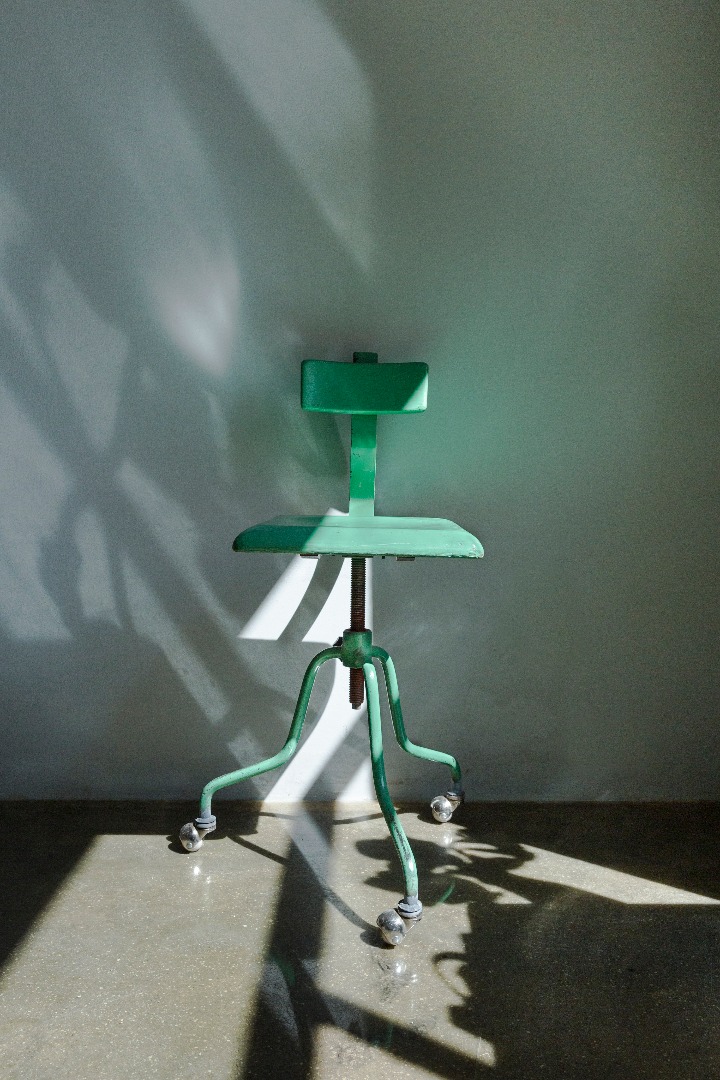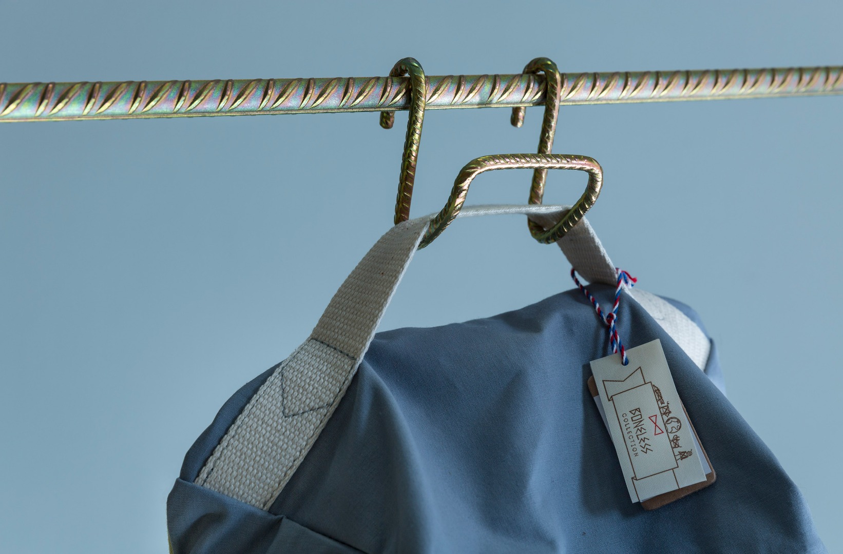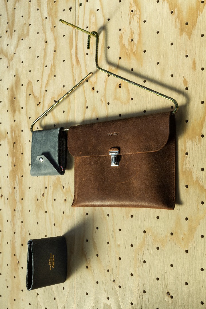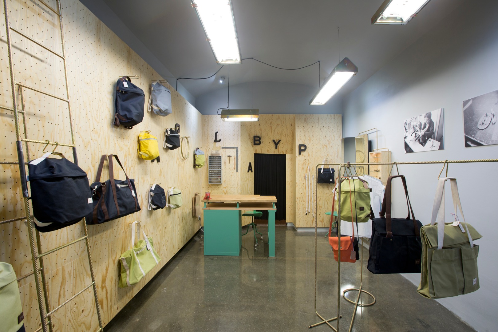 Napříč prostorem lze sledovat kombinace současného se starým, dobou prověřeným. Na ocelové židli seděla celá generace zlínských šiček, kotouče fungující jako zátěž štendrů kdysi brousily břity nástrojů. Deska sloužící jako ponk i prodejní pult dohromady rovněž odkazuje na řemeslnou tradici. Ostatně showroom Playbagu má sloužit i jako servisní prostor v případě, že se poškodí některý z komponentů na batohu, na pultu vám jej rovnou opraví. Autenticita je pro Playbag zásadní esencí.