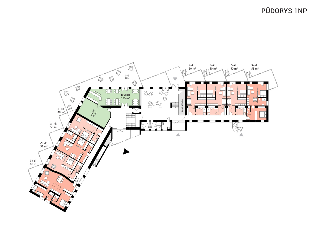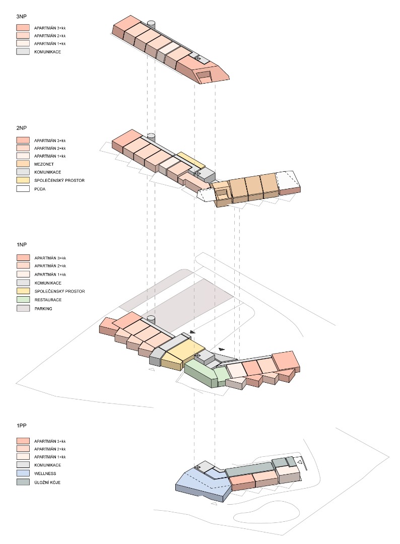 i umístěna vertikální komunikace vedle stávajícího výtahu. Z této středové části se vstupuje do jednotlivých křídel s apartmány, bistra a wellness. Umístění vstupu umožňuje případně návštěvníkům, kteří nejsou majiteli apartmánů – využití restaurace, wellness. Do křídla horního (původní hotelové pokoje) je vstup možný i ve stávající podobě, zrušeno je však schodiště vedoucí do pater. Do vedlejšího křídla je možné vstoupit přímo z terénu, do místa, kde jsou situovány ski boxy k jednotlivým apartmánům. Směrem k fotbalovému hřišti jsou na fasádě obou objektů umístěny požární úniková schodiště, navazující na vnitřní chodbu umístěnou podél severní fasády.