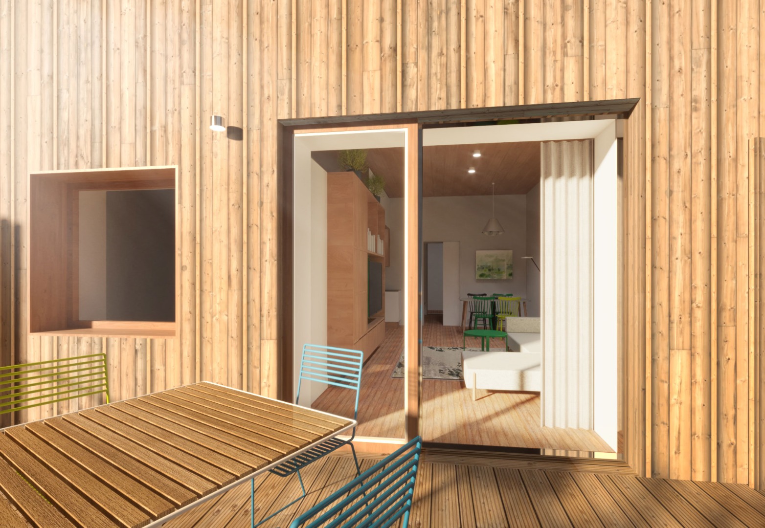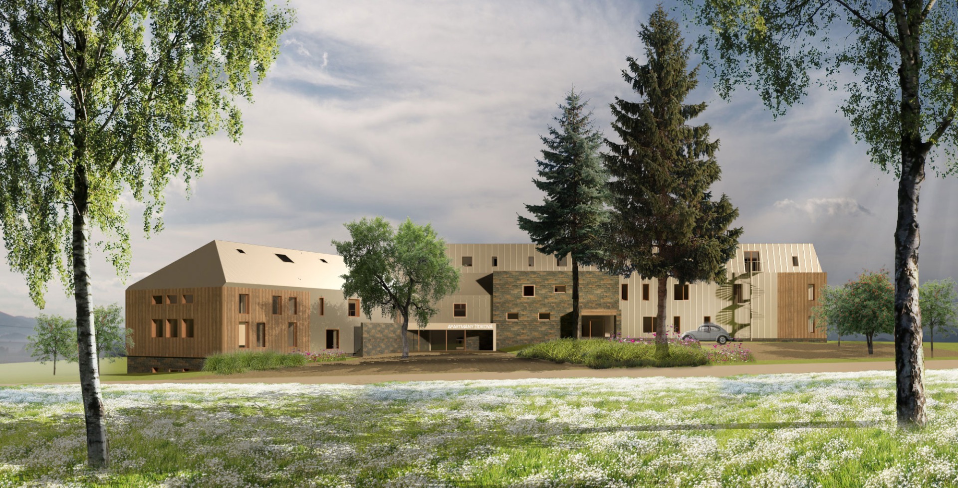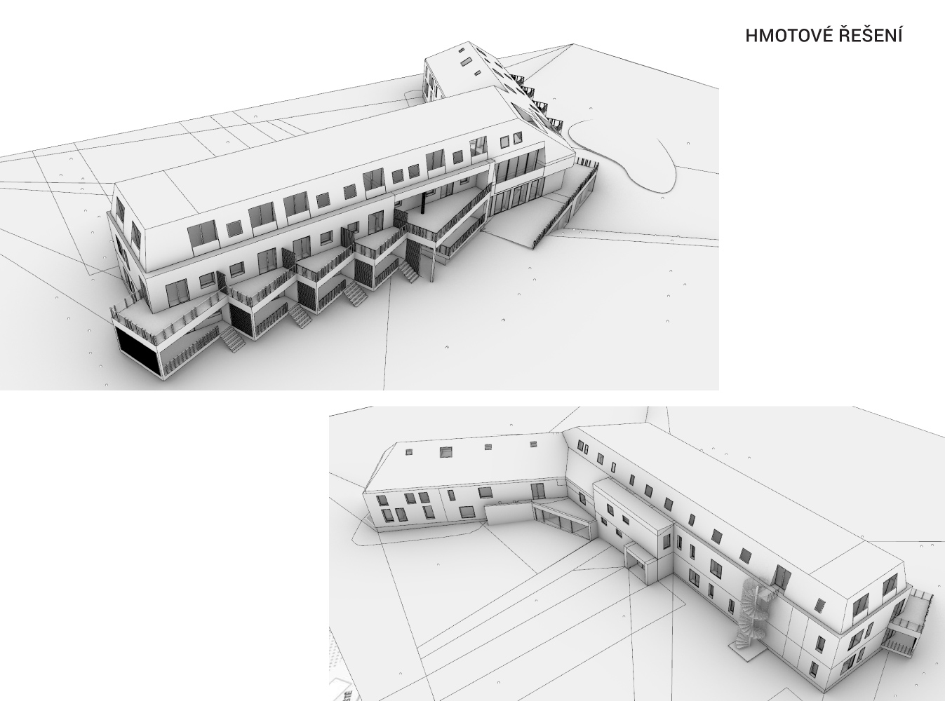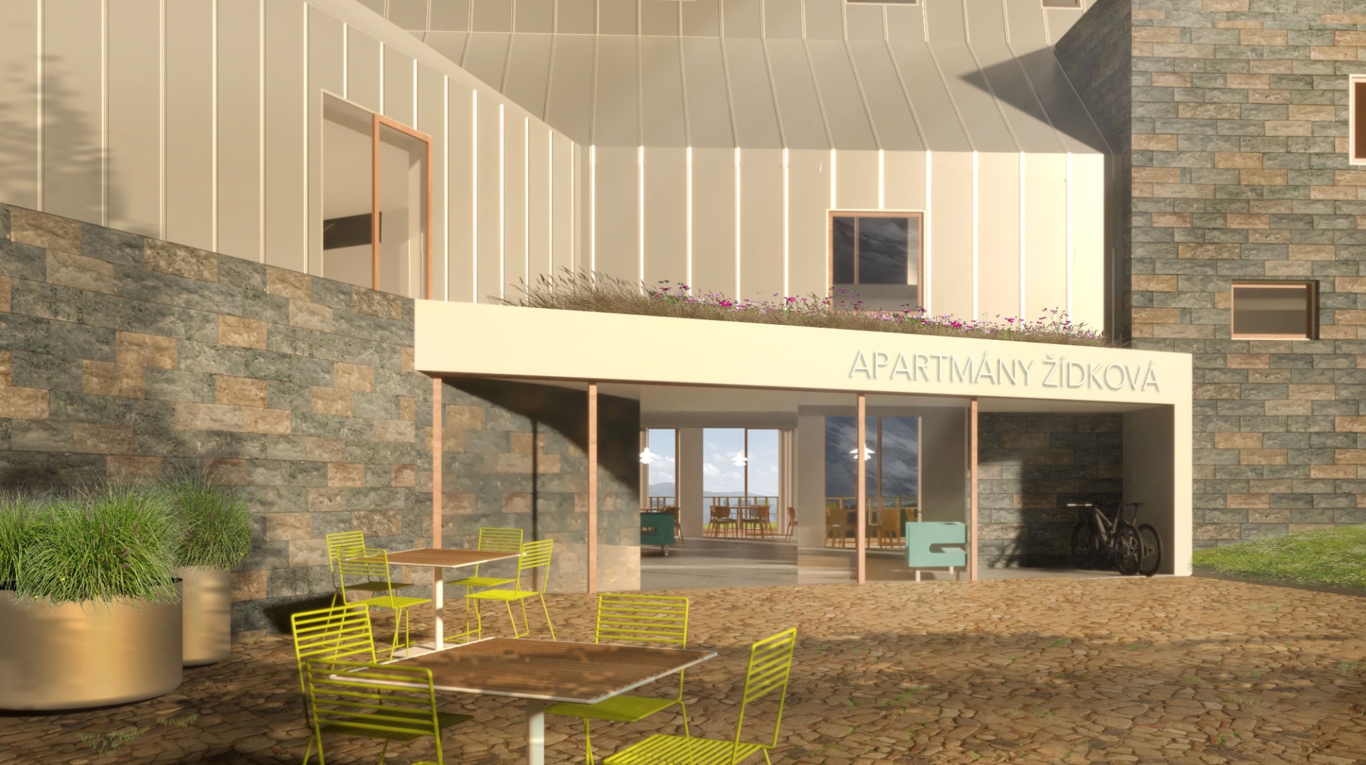 a střecha je navržena nová, tvarově scelující obě křídla objektu i jeho středovou část. Dalším prvkem, který stávající objekt tvaruje, jsou předsazené pobytové terasy apartmánů, akcentující výhled a vytvářející kontakt s vnějškem. Díky oddělujícím stěnám vzniká odclonění od sousedů.