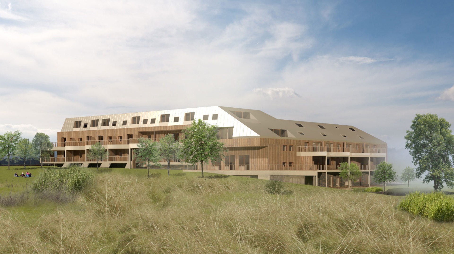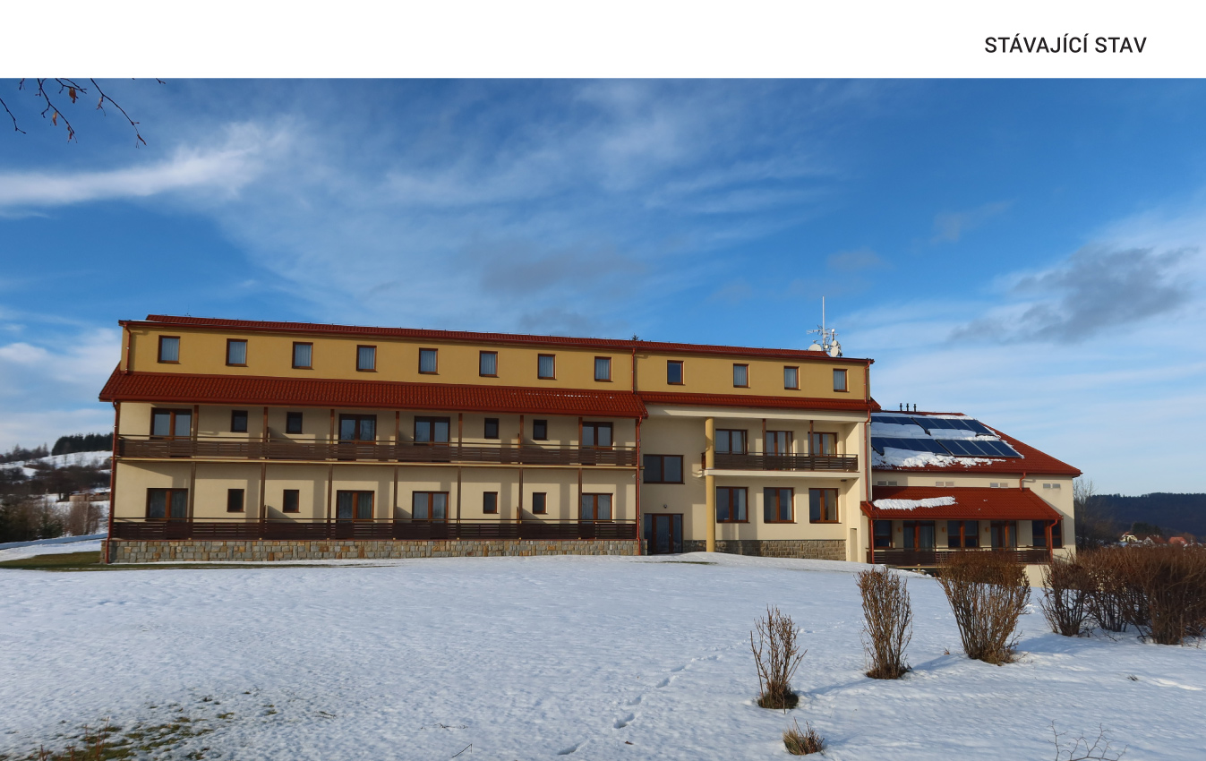 Velmi pozitivní je umístění objektu a výhled od krajiny Bílých Karpat. Trochu rozpačité je však stávající měřítko objektu. Naším záměrem bylo, aby se díky objemovým úpravám stal stávající objekt více součástí krajiny a jeho převýšené měřítko bylo potlačeno.