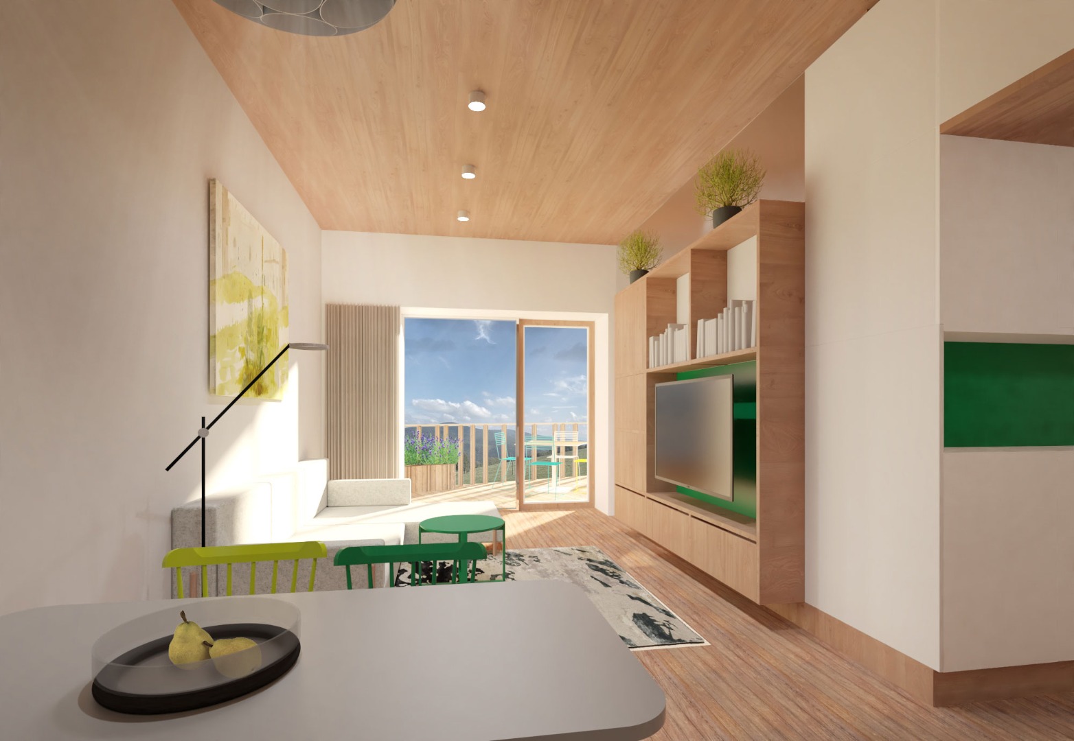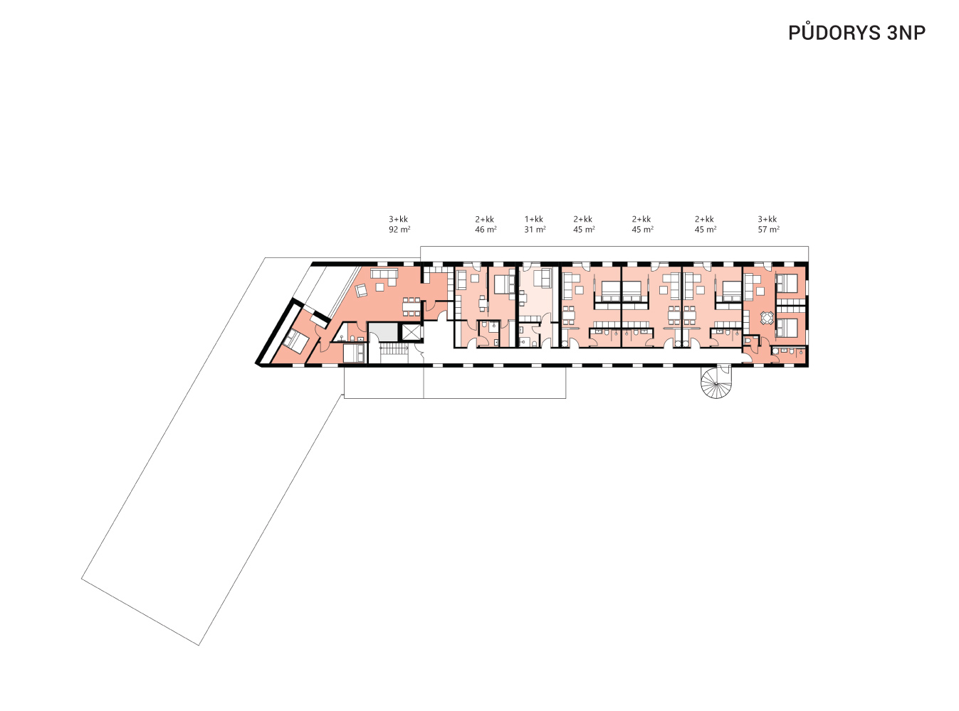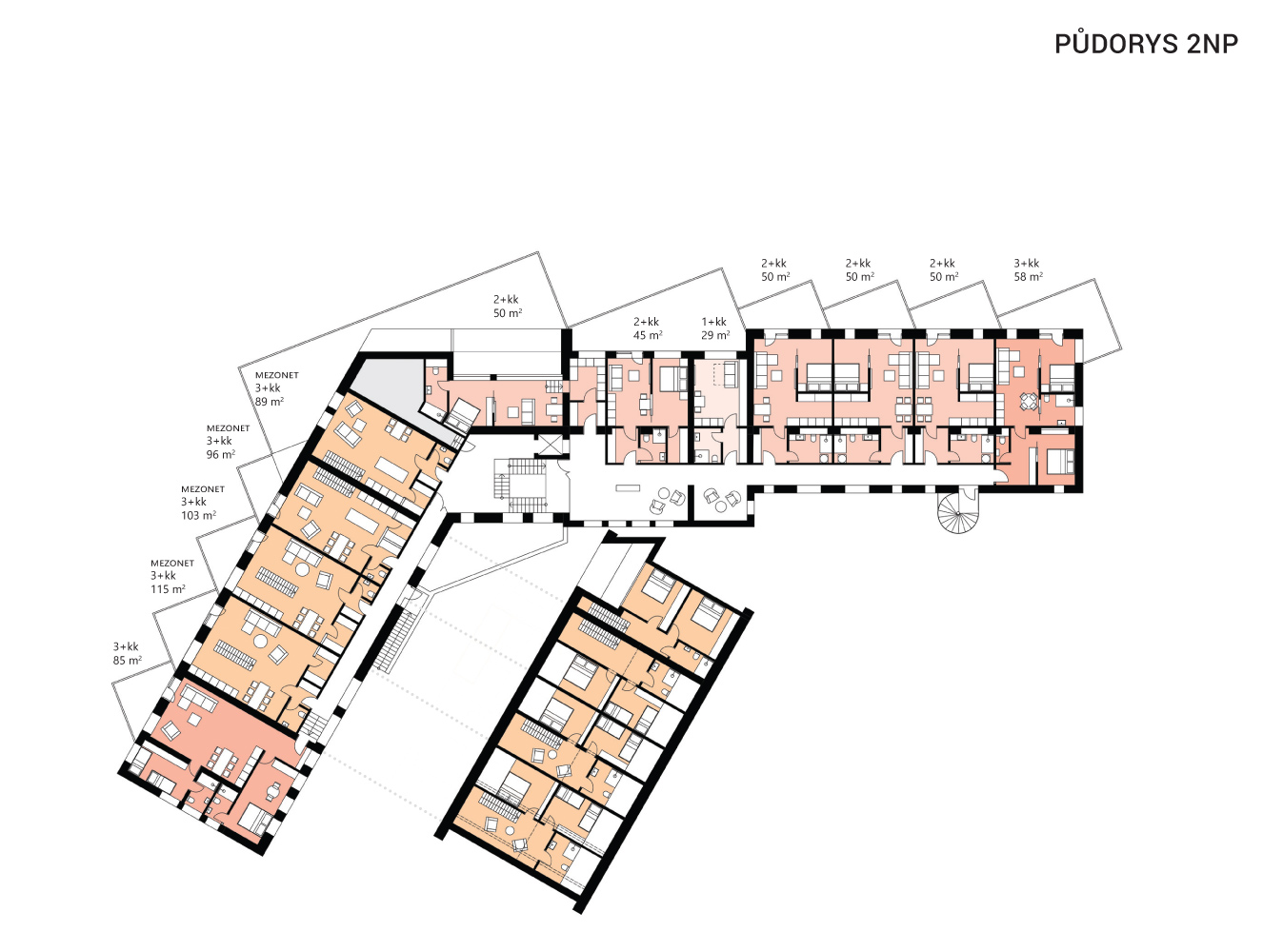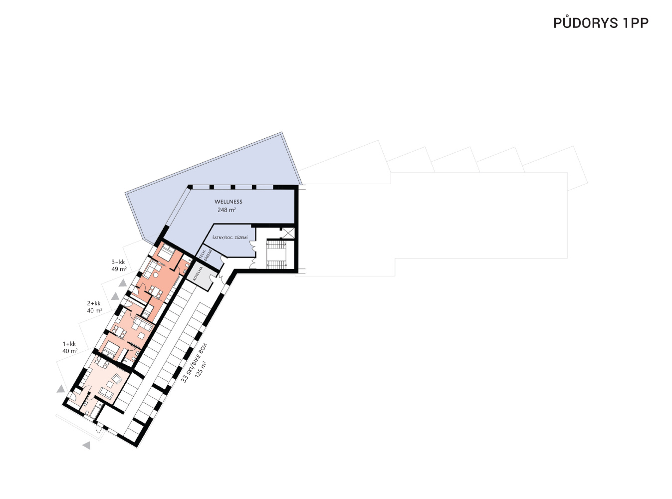 Apartmány jsou umístěny v obou křídlech objektu, počet apartmánů je 30–v konceptu jsou řešeny jako 1+kk, 2+kk, 3+kk – v křídle východním jsou navrženy i mezonety. Všechny apartmány jsou situovány s výhledem na jih a přístupové chodby jsou umístěny na sever. Bistro a wellness se nachází ve středové části.