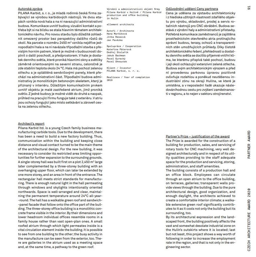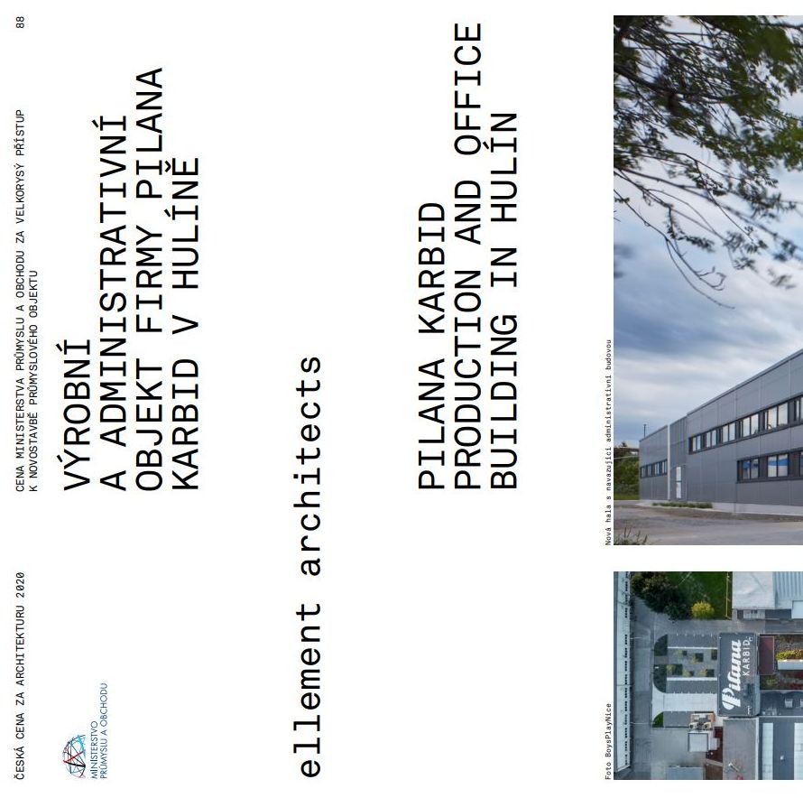 Máme velkou radost, že realizace Výrobní a administrativní objekt firmy Pilana Karbid v Hulíně obdržela cenu Cena Ministerstva průmyslu a obchodu ČR za velkorysý přístup k novostavbě průmyslového objektu za rok 2020