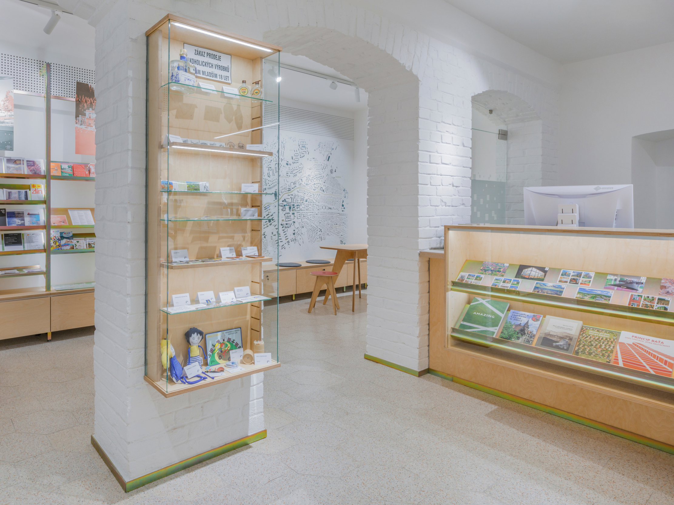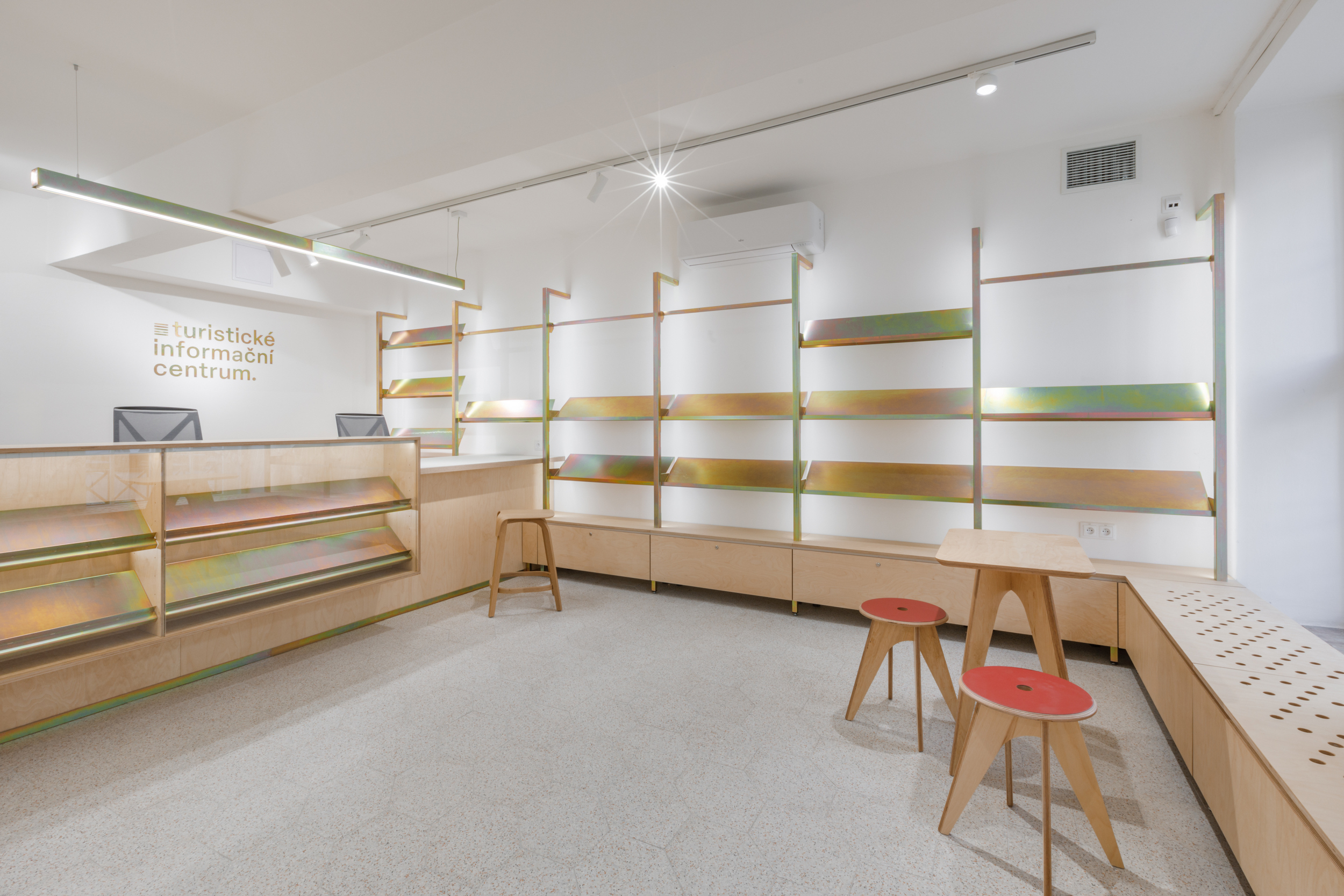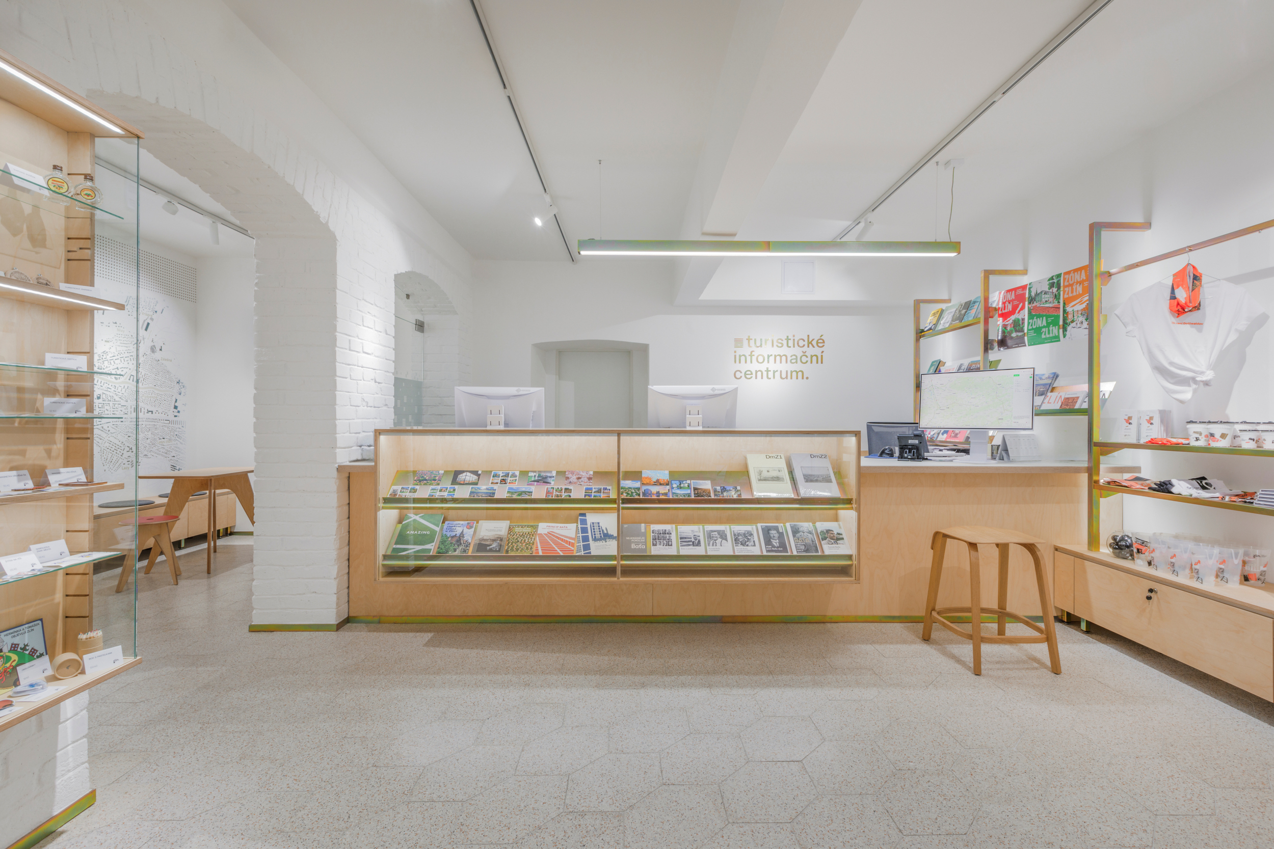 Původní sklepní prostor byl vyčištěn od technologických rozvodů pod stropem, proběhly instalace vzduchotechniky a středová zeď se zaklenutými průchody byla očištěna na cihlu a ošetřena bílým nátěrem. Nová odolná podlaha je z řezaných teracových dlaždic. Interiér TIC obsahuje celou řadu funkčních požadavků, které se můžou v čase proměňovat. Proto byl navržen atypický policový systém z ocelového plechu v povrchové úpravě žlutým zinkem, který je kombinován s nábytkem z březové překližky. Plechové police umožňují variabilní sestavy a vymezování jednotlivých letáků a prospektů pomocí magnetů. Police jsou k dispozici v několika typech, podle předpokládaného využití, včetně hrazdy na prezentaci plakátů a triček. Předsazené stojky s LED pásky z nepohledové strany nasvěcují obsah polic a vytvářejí tak příjemnou atmosféru. Interiér je doplněn stoly a stoličkami od zlínské firmy Sosone, barevně sladěnými s interiérem.