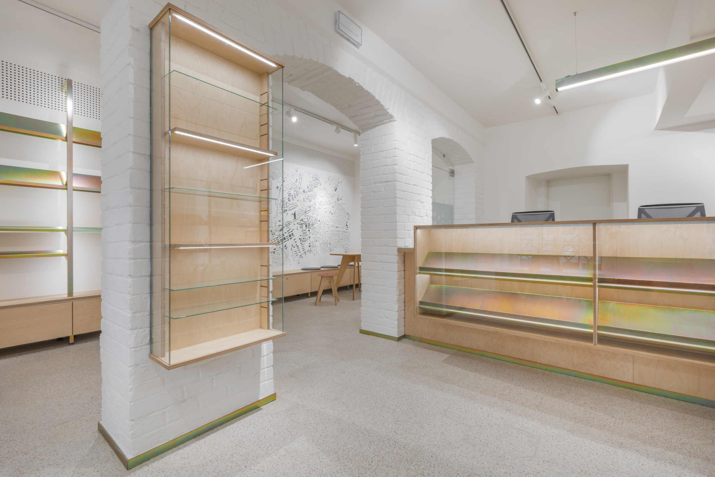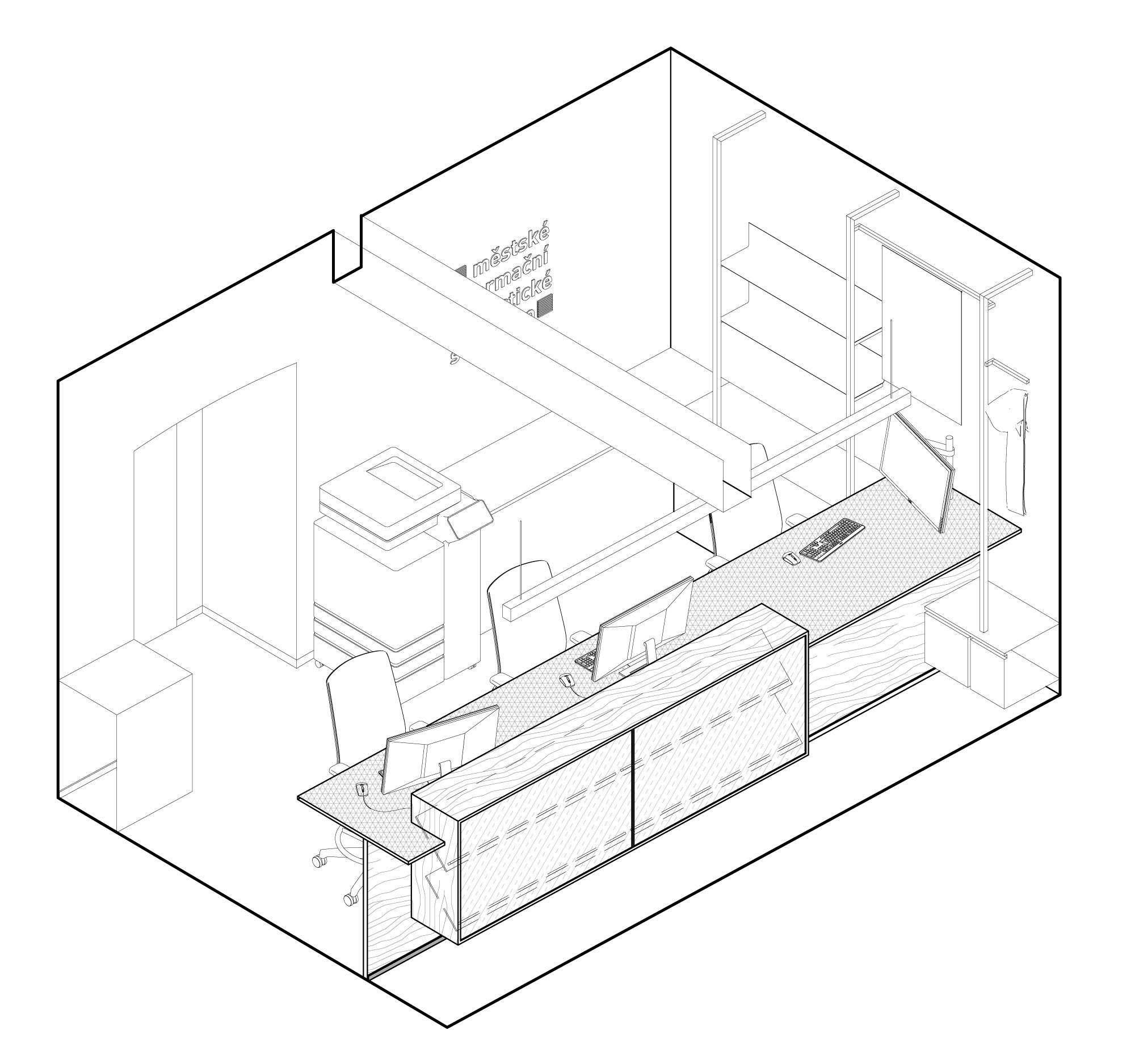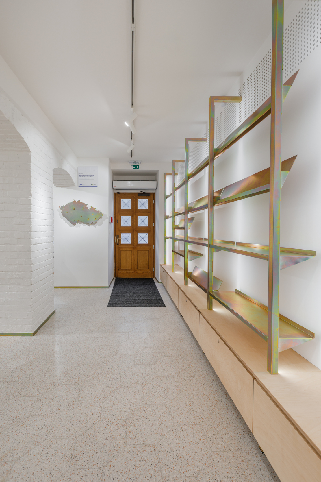 Původní sklepní prostor byl vyčištěn od technologických rozvodů pod stropem, proběhly instalace vzduchotechniky a středová zeď se zaklenutými průchody byla očištěna na cihlu a ošetřena bílým nátěrem. Nová odolná podlaha je z řezaných teracových dlaždic. Interiér TIC obsahuje celou řadu funkčních požadavků, které se můžou v čase proměňovat. Proto byl navržen atypický policový systém z ocelového plechu v povrchové úpravě žlutým zinkem, který je kombinován s nábytkem z březové překližky. Plechové police umožňují variabilní sestavy a vymezování jednotlivých letáků a prospektů pomocí magnetů. Police jsou k dispozici v několika typech, podle předpokládaného využití, včetně hrazdy na prezentaci plakátů a triček. Předsazené stojky s LED pásky z nepohledové strany nasvěcují obsah polic a vytvářejí tak příjemnou atmosféru. Interiér je doplněn stoly a stoličkami od zlínské firmy Sosone, barevně sladěnými s interiérem.