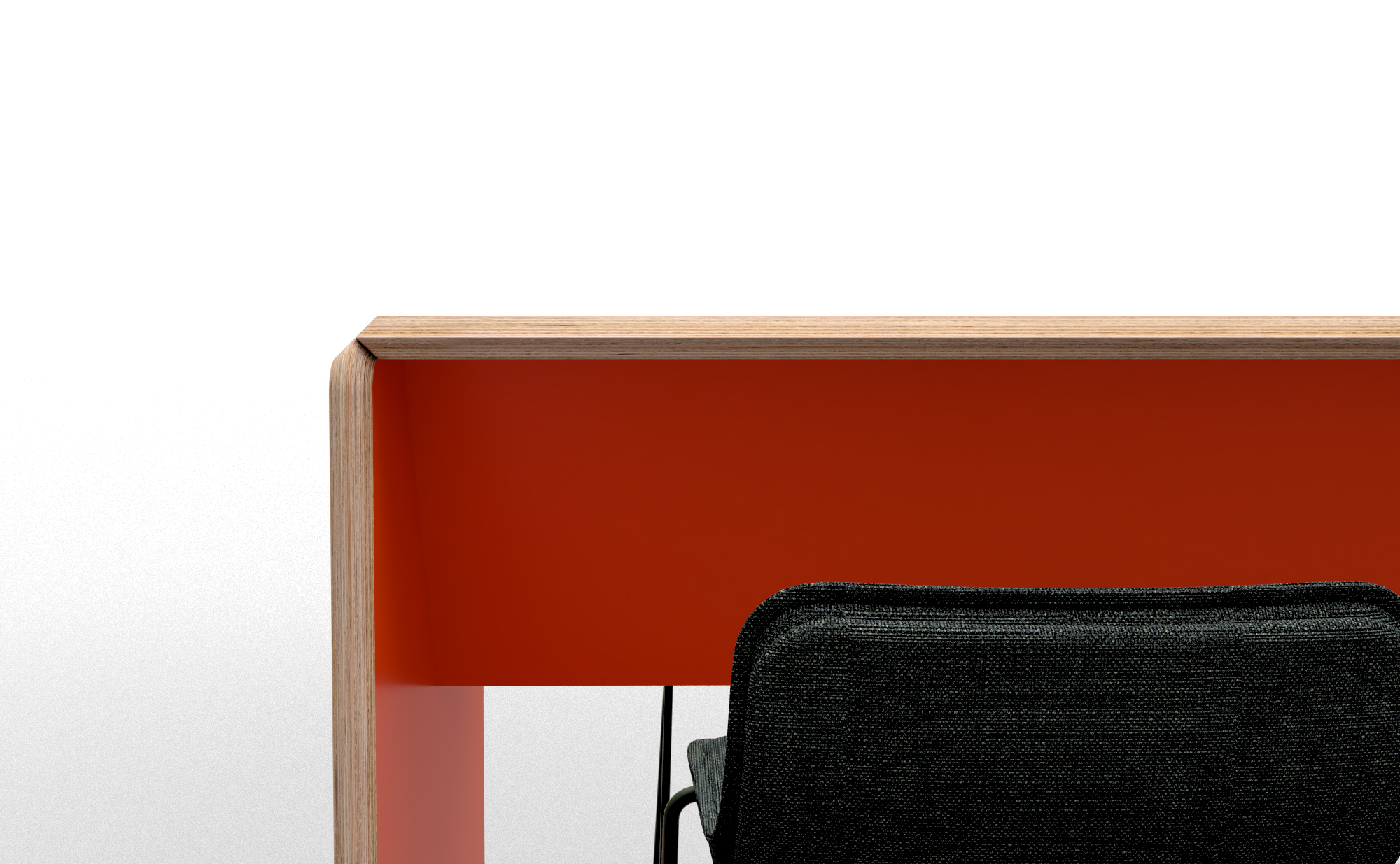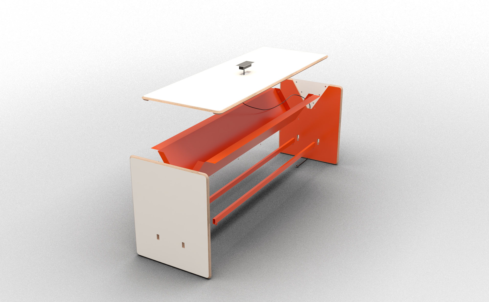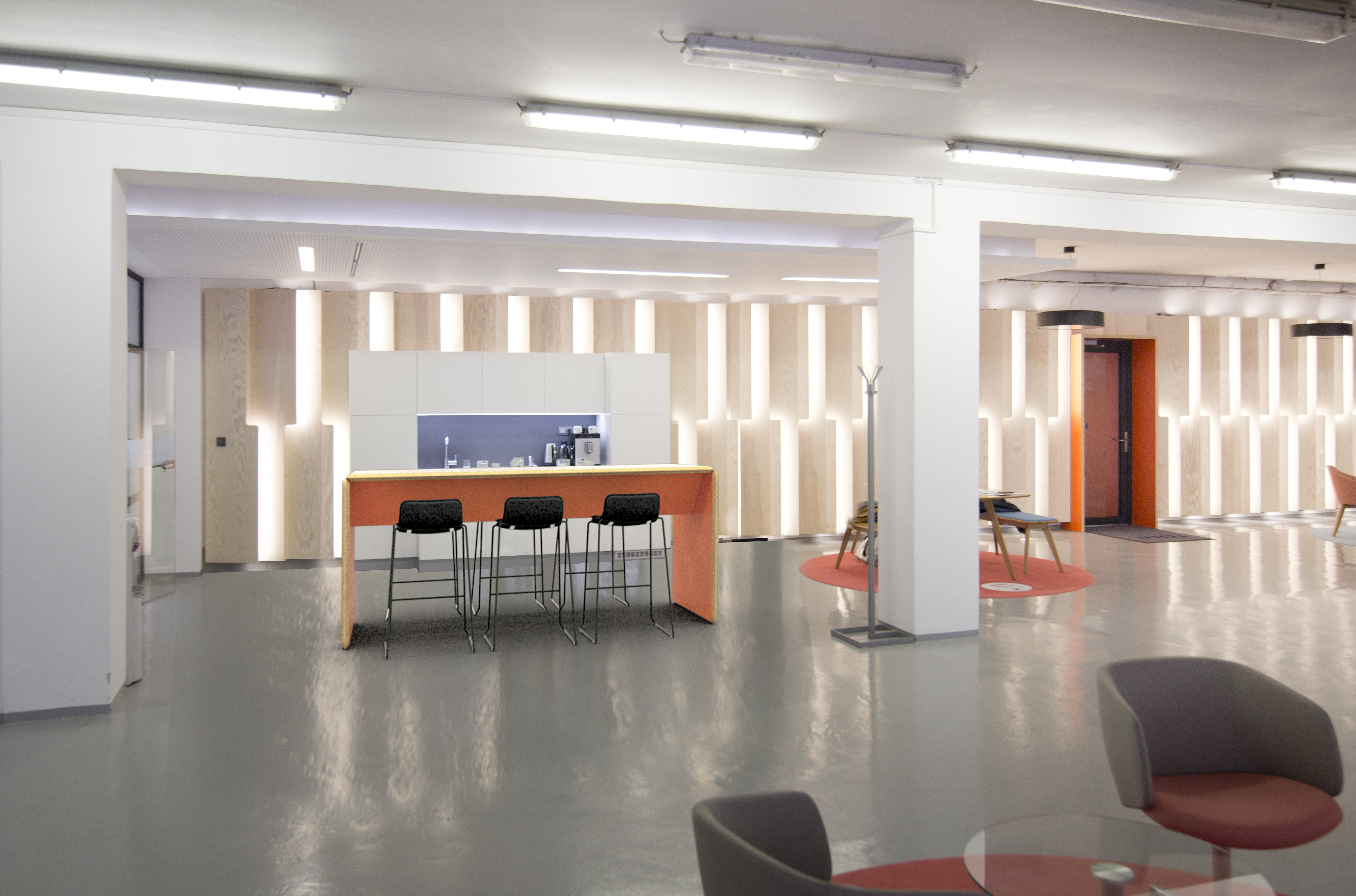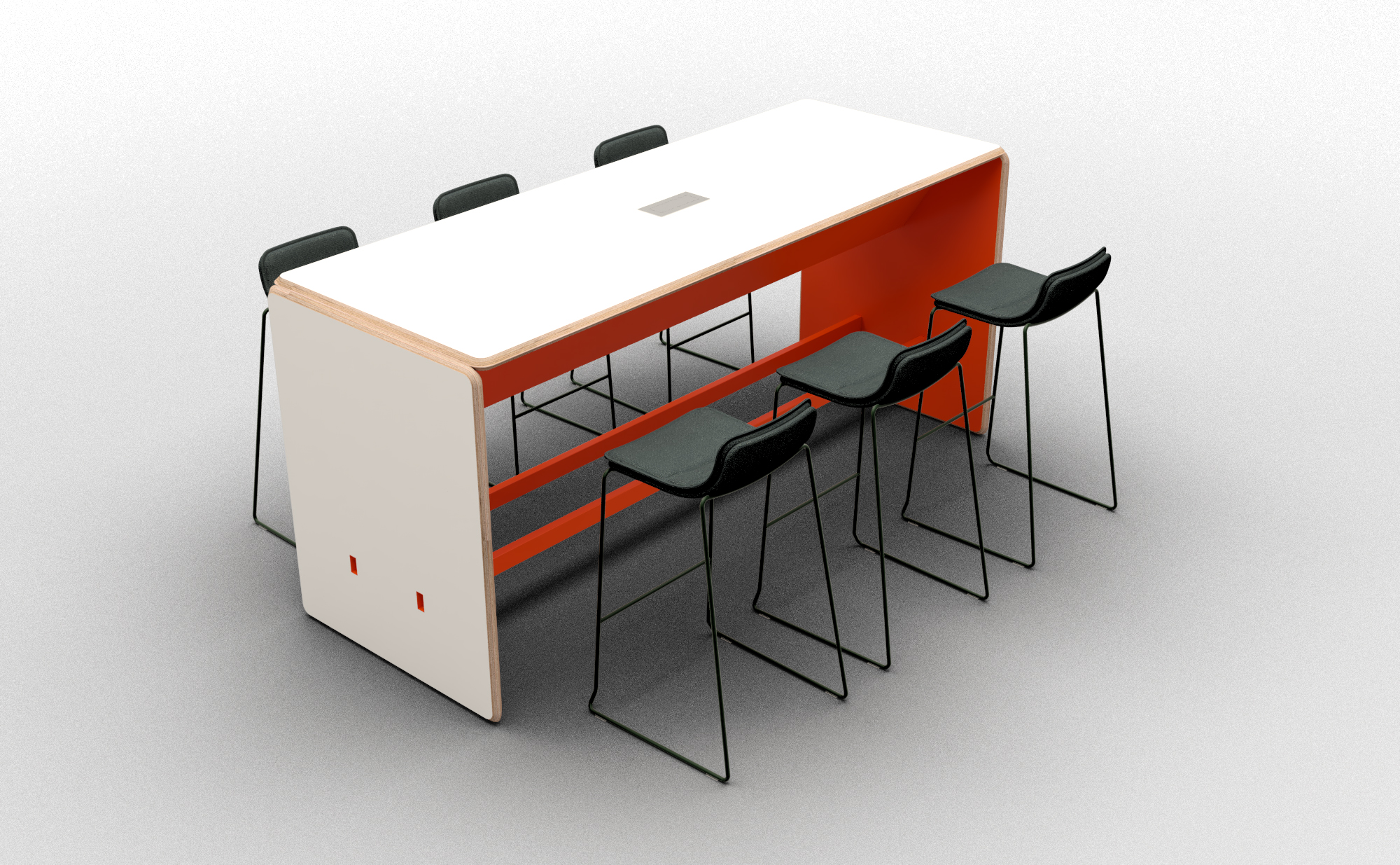 RimBar je místem setkávání v prostředí kanceláří i místem pro rychlý oběd ve firemní jídelně, vyšší sezení je pro změnu uvažování důležité. Jednoduchá konstrukce stolu je postavena na statickém prvku „tunelu, který ztužuje stolovou desku a umožňuje stabilní uchycení bočnic. Pohledová strana překližky je ofrézována na 45°, hrana stolu je tak příjemnější pro položení rukou a při sesazení s bočnicí tvoří signifikantní detail. Barevnost dostává prostor na vnitřní straně stolu a neruší.