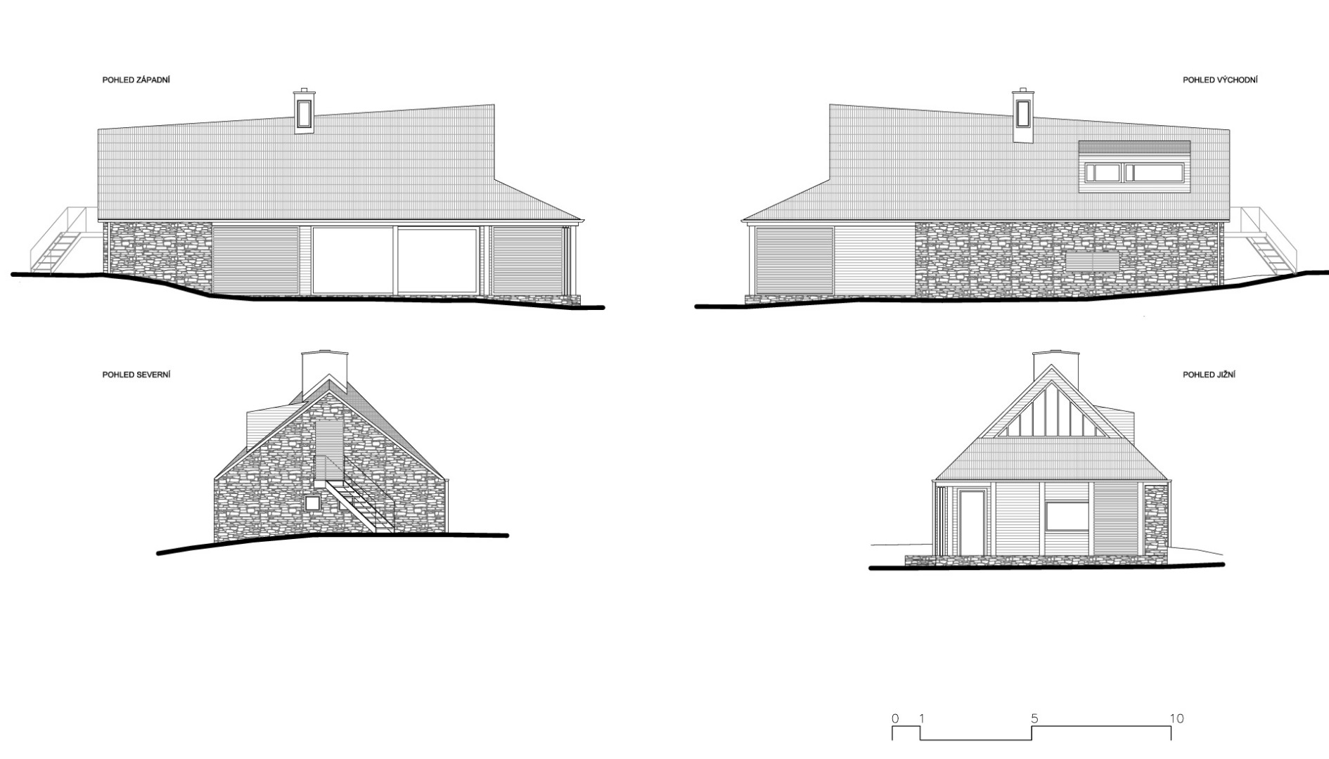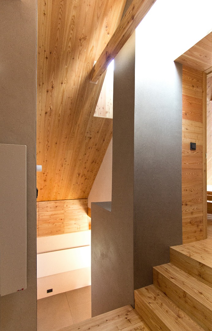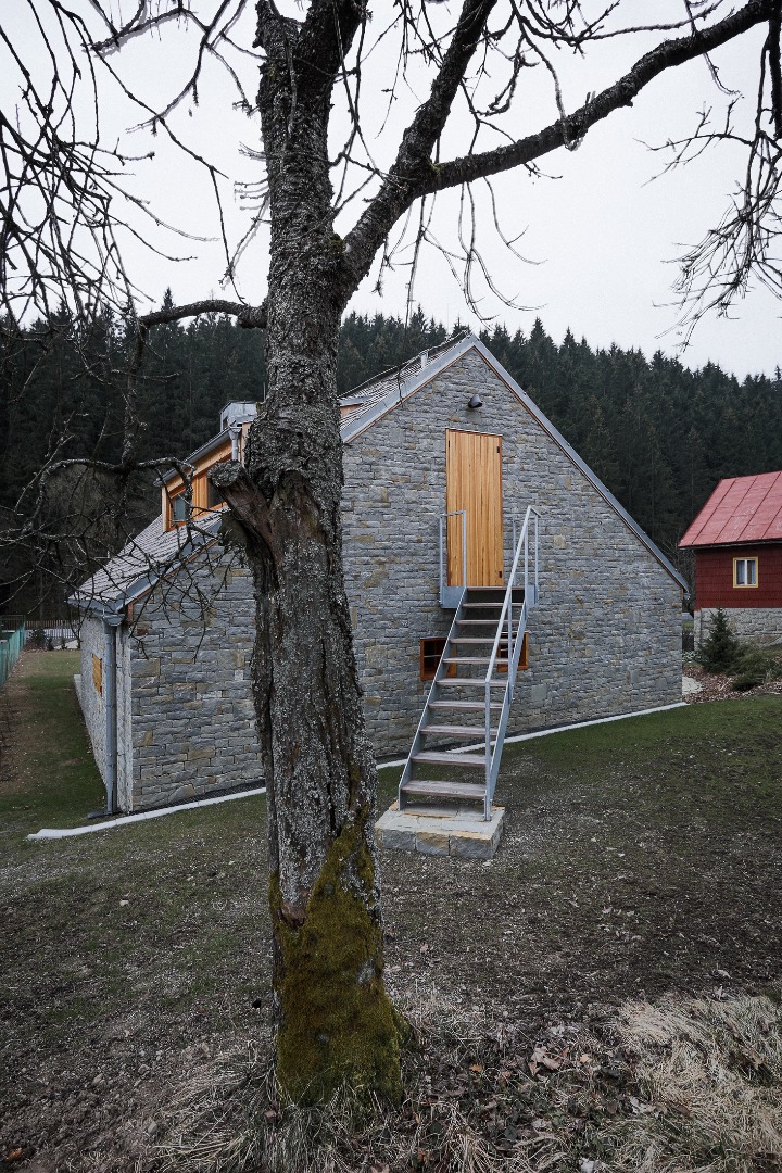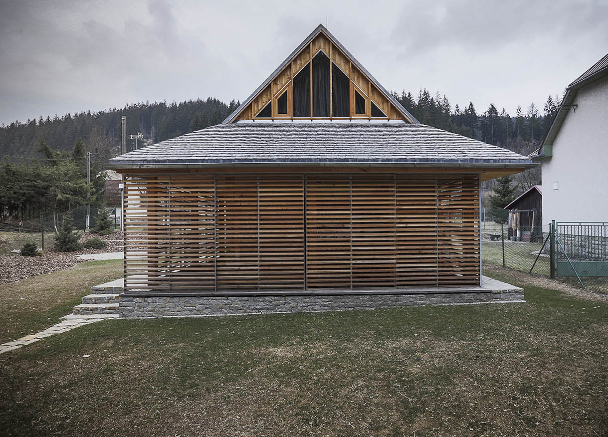 Samotný dům je navržen jako dva tradiční domy v jednom. Zadní část domu včetně bočních stěn, které jsou v kontaktu s terénem, odkazují na kamennou stodolu. Podkroví a přední část domu, která je oddělena verandami a skladem dřeva od terénu je přepisem dřevěnice. Tvaroslovím i použitými materiály jsme reagovali na dané místo a jeho možnosti. Při stavbě domu jsme proto používaly tradiční materiály – pískovec z lomu Bzová, modřínové šindele a obklady z modřínu provazující exteriér i interiér domu. Z východní strany objektu je zapuštěním stěny a přesazením střechy vytvořen sklad dřeva, typický prvek pro valašské chalupy.