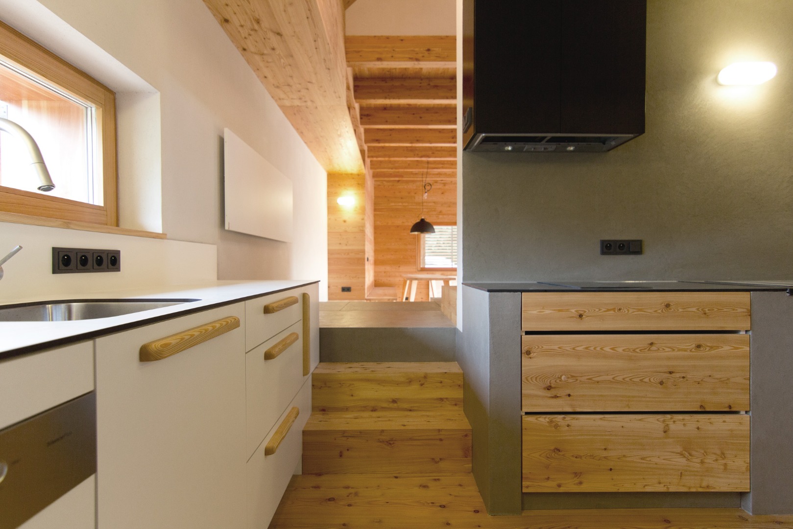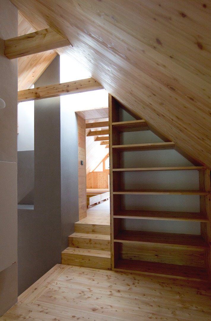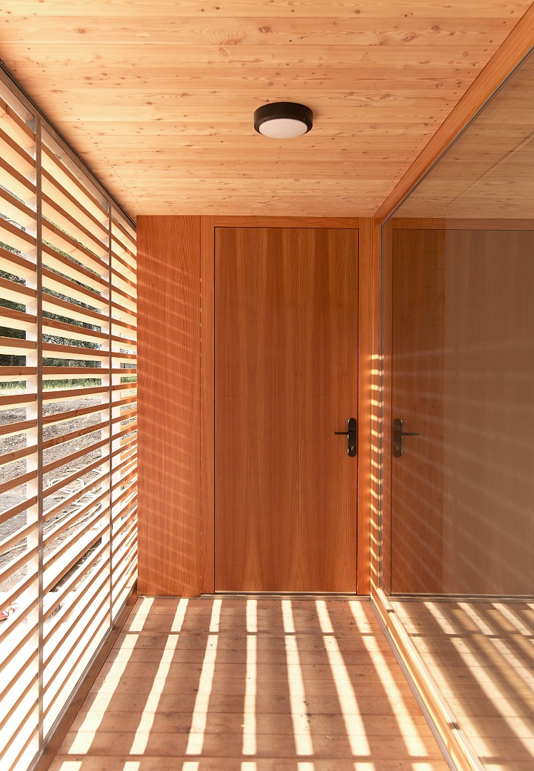 Samotný dům je navržen jako dva tradiční domy v jednom. Zadní část domu včetně bočních stěn, které jsou v kontaktu s terénem, odkazují na kamennou stodolu. Podkroví a přední část domu, která je oddělena verandami a skladem dřeva od terénu je přepisem dřevěnice. Tvaroslovím i použitými materiály jsme reagovali na dané místo a jeho možnosti. Při stavbě domu jsme proto používaly tradiční materiály – pískovec z lomu Bzová, modřínové šindele a obklady z modřínu provazující exteriér i interiér domu. Z východní strany objektu je zapuštěním stěny a přesazením střechy vytvořen sklad dřeva, typický prvek pro valašské chalupy.