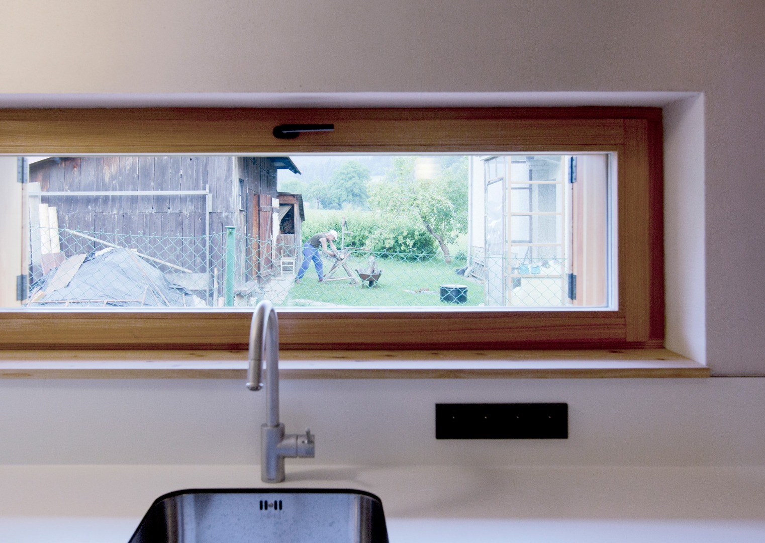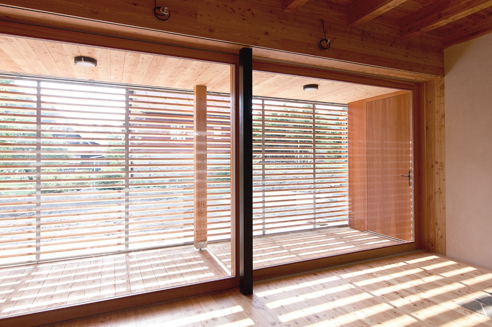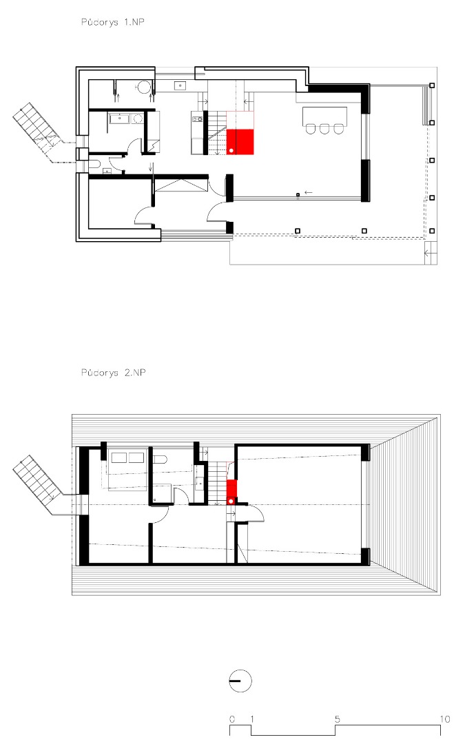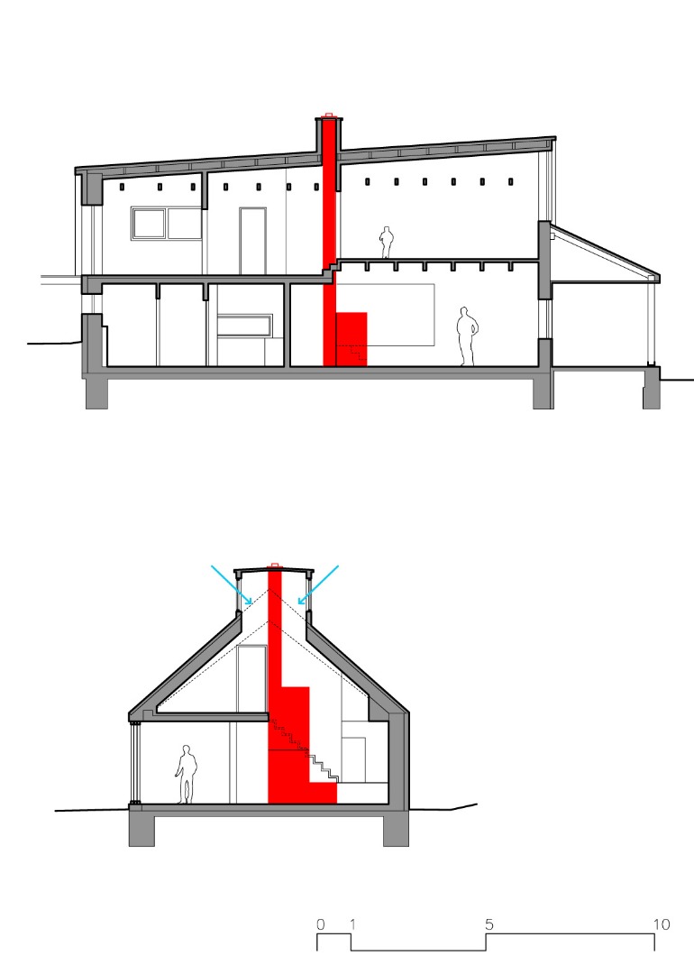 Srdce domu – pomyslné světlo a teplo tvoří pec, která je umístěna ve středu dispozice. Kolem ní se odvíjí život. Podél pece stoupá schodiště do podkroví objektu. Toto místo je také přisvětleno světlíky působící jako komínové těleso a díky tomu světlo dopadá do středu - těžiště domu. Hřeben střechy ze zadu dopředu stoupá, reaguje na vnitřní dispozici. Dům vyrůstá ze svahu a dostává působivé měřítko. Dům je ze tří stran možné uzavřít posuvnými dřevěnými paravány, kterými se uzavírá západní i jižní veranda a zároveň se vytváří intimní prostor. Tím dochází k odstínění od rušné komunikace, paravány zároveň fungují jako bezpečnostní prvek pro uzavření objektu.