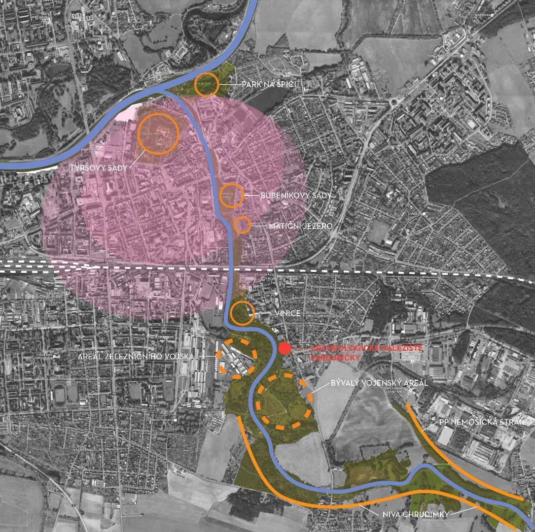 Význam místa je kromě jeho historické hodnoty dán také polohou na krajinné ose Pardubic podél toku Chrudimky. Od centra města k jeho okraji se táhne zelený pás – Náhrdelník Chrudimky, na němž leží řada parků nebo rozvojových ploch s rekreačním potenciálem (bývalý vojenský areál nebo areál železničního vojska) a pokračuje dále za hranice města nivou a přírodní památkou Nemošická stráň.