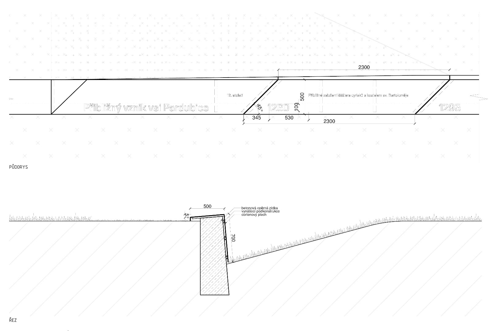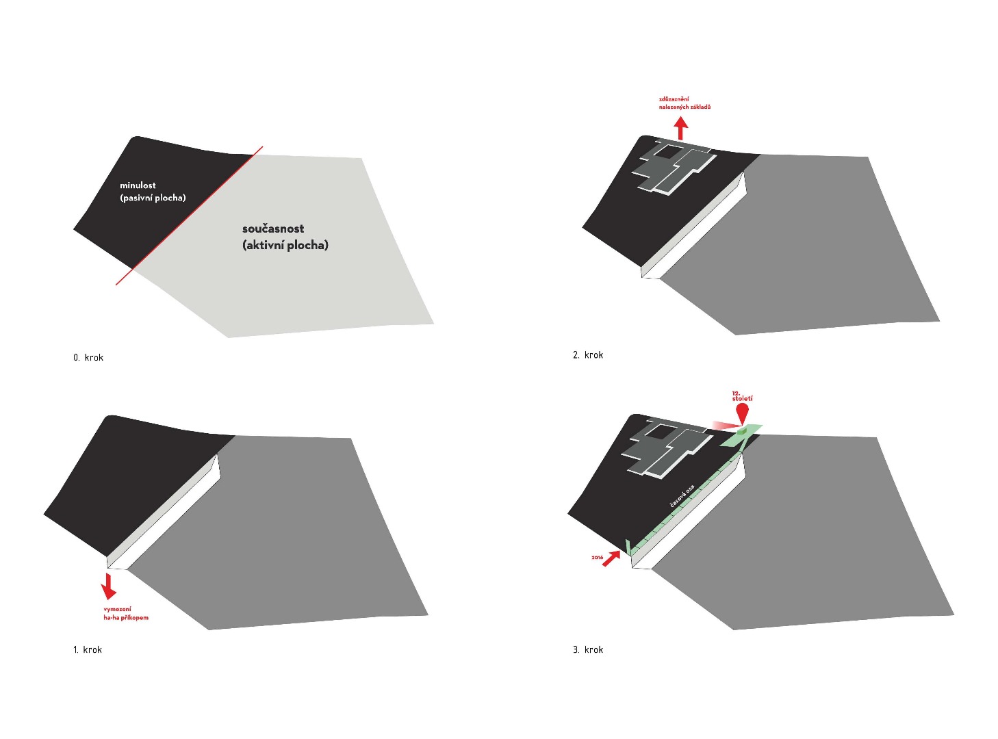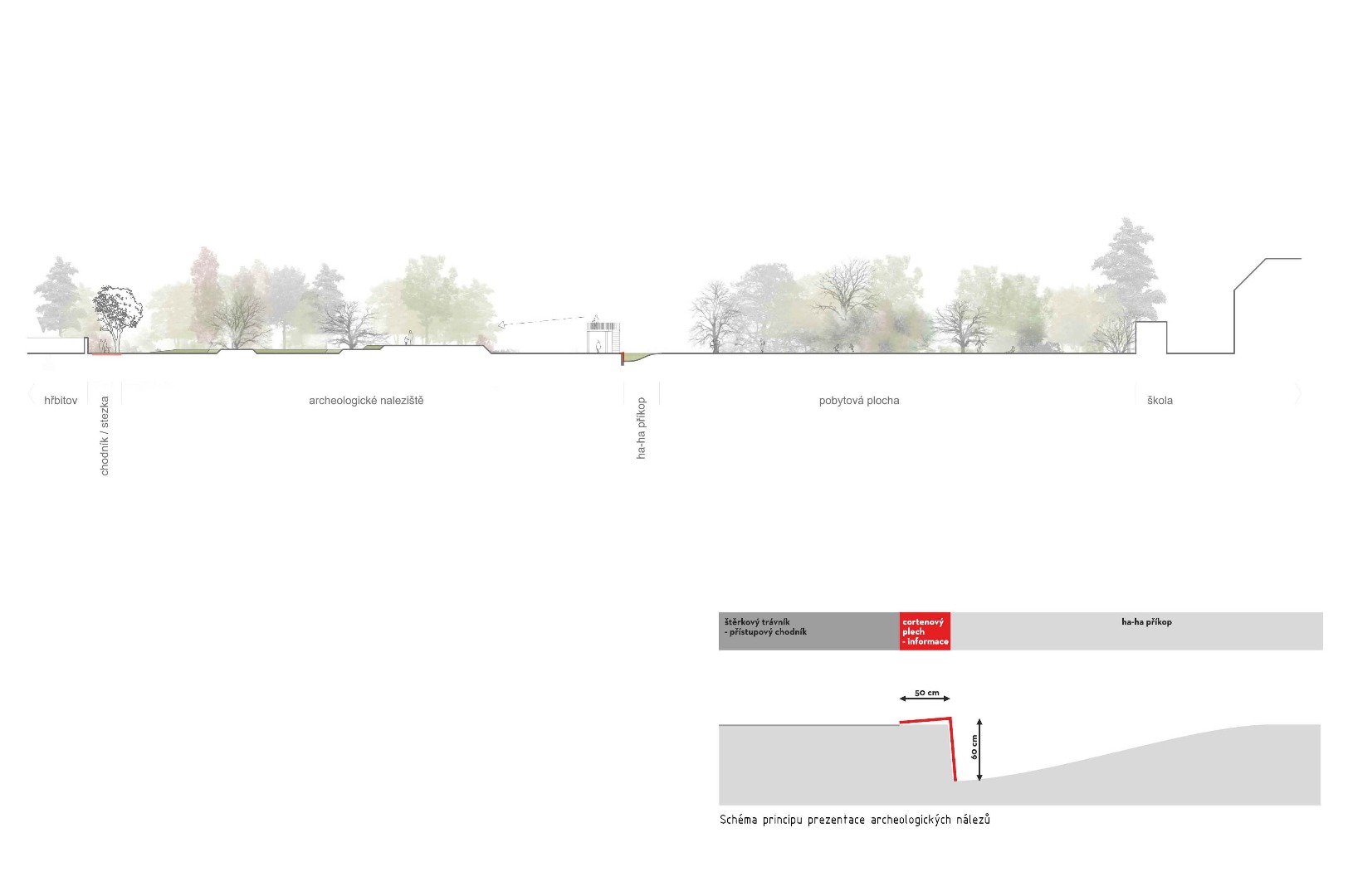 Ha-ha příkopem se rozumí vyhloubený terénní prvek, který má jednu stranu téměř svislou opatřenou cortenovým plechem, druhá zatravněná naopak pozvolna stoupá na úroveň okolního terénu. Příkop tak není optickou bariérou, ale definuje vazbu mezi minulým a přítomným a upozorňuje na odlišné charaktery území. Hloubka příkopu bude 0,5m. Opěrná zídka příkopu a také její koruna bude opatřena plechem z cortenové oceli, který je součástí informačního systému a tvoří časovou osu s vazbou k nalezišti a historii místa.