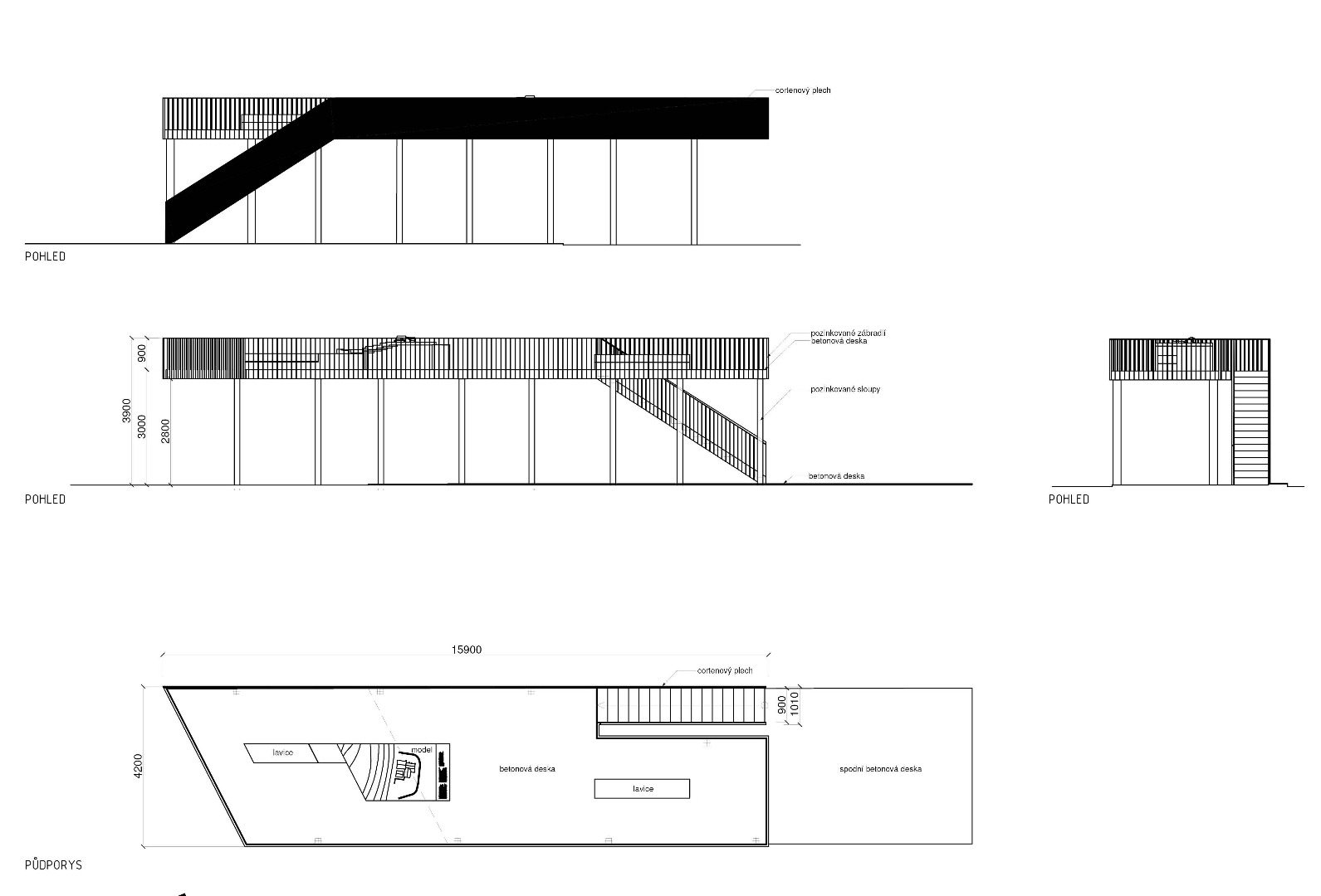 Na linii příkopu leží altán nabízející přístřeší a vyhlídku s modelem. Altán je tvořen dvěma horizontálními deskami z probarveného betonu, vynesenými ocelovými sloupy. Střecha altánu / vyhlídková terasa je přístupná přímým schodištěm z cortenové oceli, které navazuje na korunu opěrné zídky, resp. časovou osu. Altán je vybaven základním mobiliářem - sedacími prvky, stojanem na kola a odpadkovým košem. Ve stropní desce budou zapuštěná svítidla.