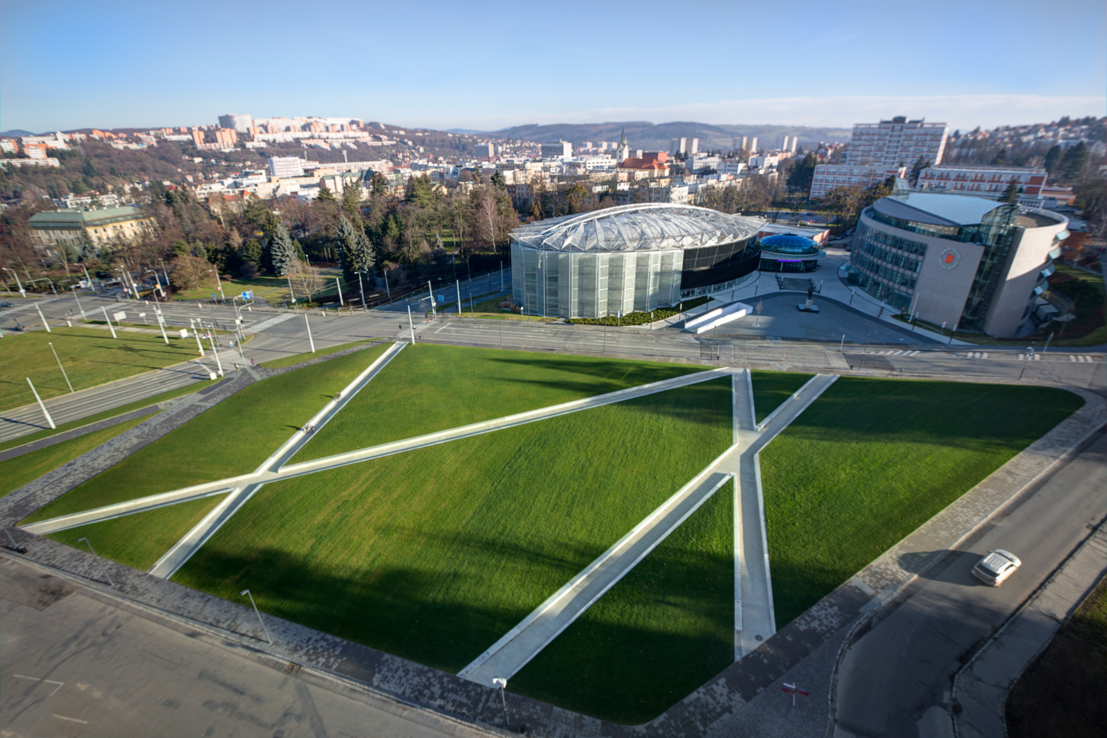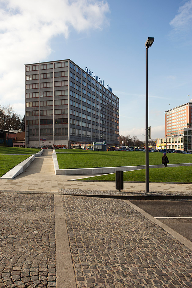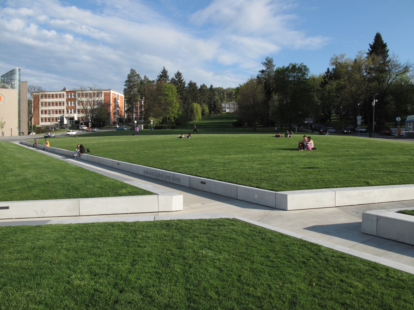 Naším hlavním záměrem se stalo naplnění základní a na první pohled jednoduché ideje „Projít a nepřerušit“. Projít – umožnit lidem volný pohyb v prostoru, který je kultivovaný, čistý, přehledný a funkční, nepřerušit – cíleně reagovat na koncepci F. L. Gahury. Tedy vztahovat projekt jak k lidskému, tak k urbanistickému měřítku. Tento záměr byl zrealizován prostřednictvím modelace terénu plynulým vypnutím tvaru travnatých ploch do podoby mírných kopečků a vybudováním nových chodníků zapuštěných pod úroveň terénu. Pro vzdáleného pozorovatele tak vzniká dojem, že území je zatravněné a celistvé, nepřerušený pás zeleně se opticky sčítá a vytváří efekt trávníkového zrcadla. Uvnitř GP naopak nově vzniklý terén chrání odpočívajícího chodce od rušné křižovatky. Každý si může pohodlně sednout na zvýšené obrubníky nebo přímo na trávník, který je zátěžový a předurčený k pobytu. Nové trasy odkazují na již existující chodníky v horní části GP, které v diagonálách rovněž protínají travnatou plochu a spojují jednotlivé objekty internátů po obou stranách. GP je místem křížení a pohybu většího počtu lidí, proto je i v návrhu zdůrazněn moment křížení protínajícími se cestami pro pěší. Modelovaná travnatá plocha je výtvarným prvkem sama o sobě. Minimalistické architektonické řešení vedlo k rozhodnutí nenarušovat prostor samostatnou skulpturou nebo objektem, ale dílem, které by se automaticky stalo jeho součástí. Tento požadavek, vybízející ke konceptuálnímu řešení, od začátku určil i výběr umělce. Tímto autorem se stal umělec Jiří Valoch. Dílo tvoří krátké textové sdělení – „pokaždé úplně jiná slova“, které je šestkrát zopakováno napříč celým prostorem na kolmých stěnách obrubníků. Text, kolem něhož lze procházet, je jednoduchý, srozumitelný, jasný každému a pokaždé jinak. Význam díla je otevřený mnoha interpretacím – věta může vyvolat emoci, nést osobní sdělení diváka-chodce, který se v prostoru nachází. Ve vztahu k pomníku Klementa Gottwalda, který se v prostoru v minulosti nacházel, můžeme „pokaždé úplně jiná slova“ chápat jako memento, připomínku poukazující na relativitu a pomíjivost veřejných pomníků, politických systémů – i relativitu samotných slov.