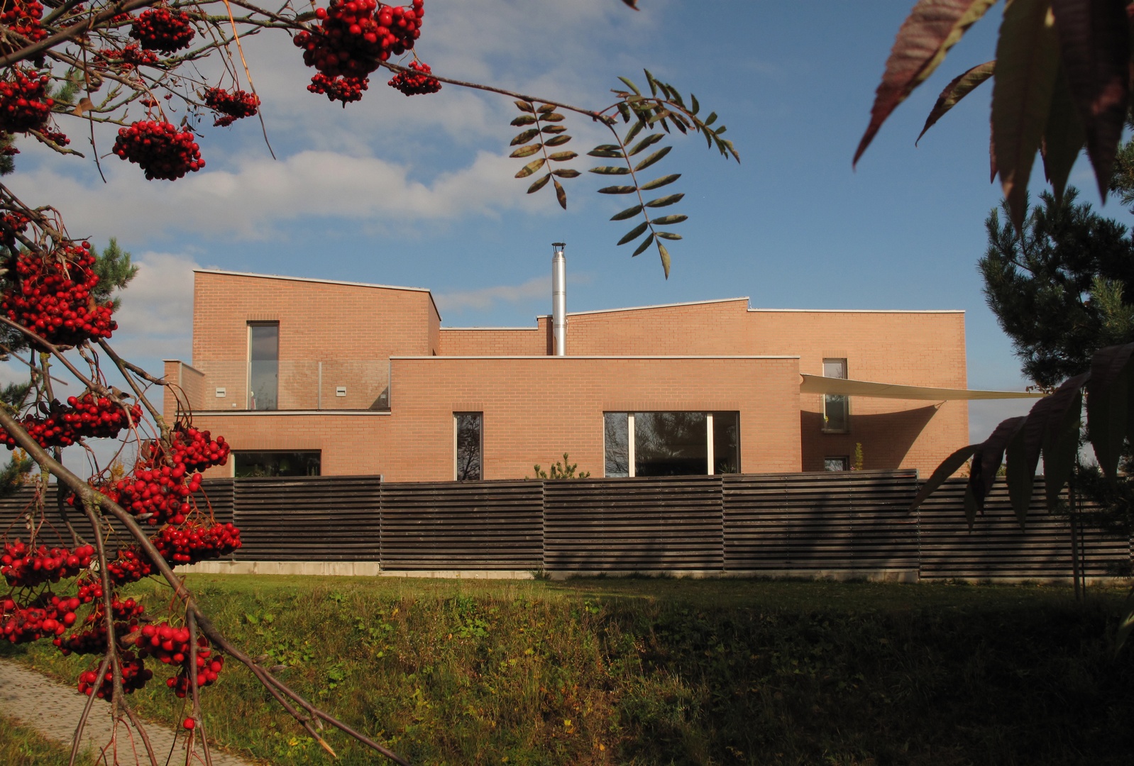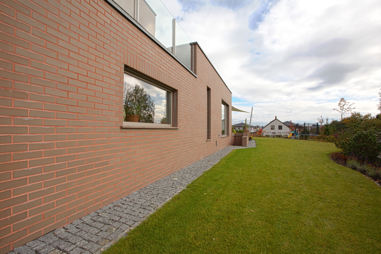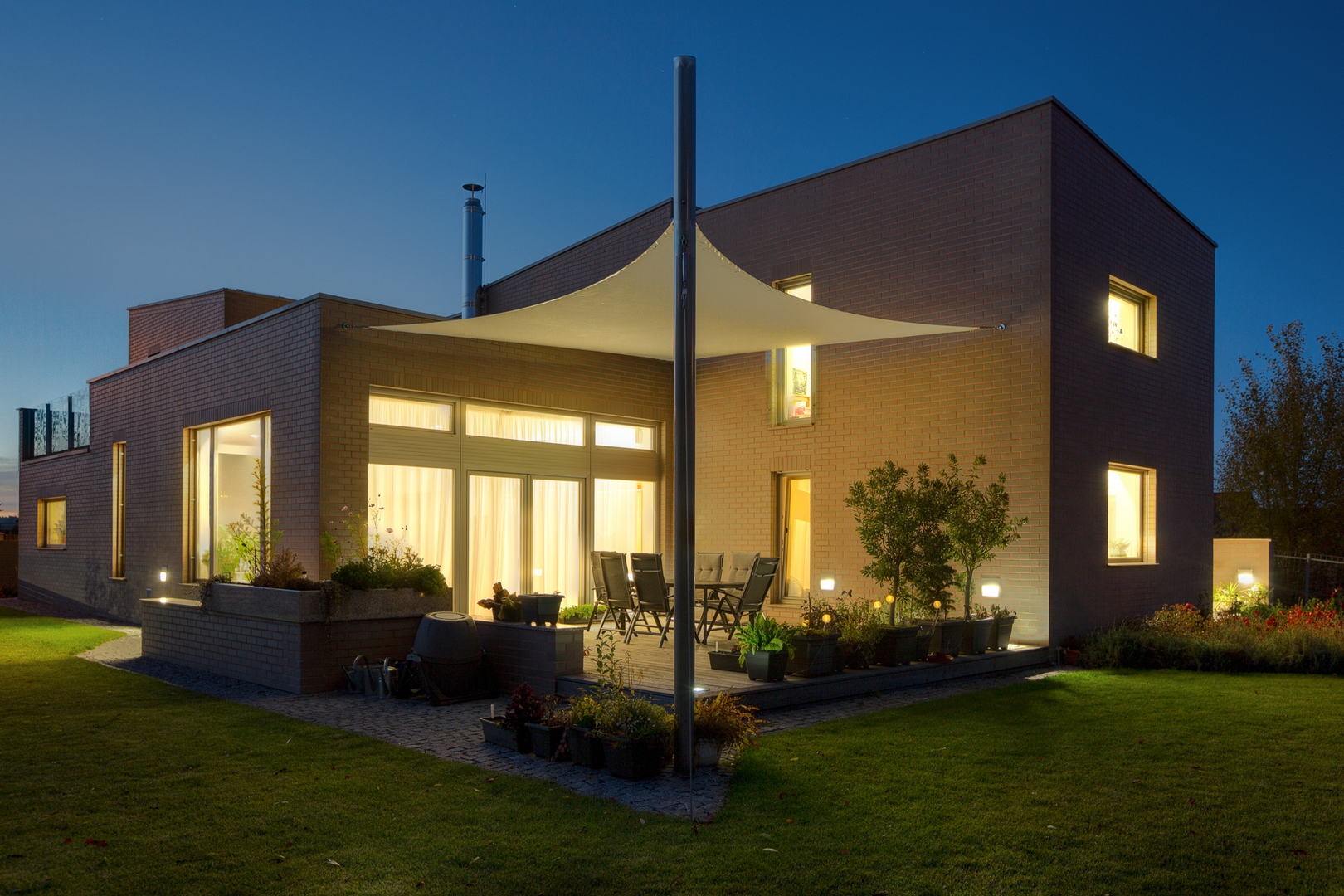 Pobytová zahrada je oplocena kombinací tří typů materiálů a tím i intenzity průhlednosti plotu. Roh ze západní strany je řešen zídkou ve stejném obkladu jako dům, brána vjezdu a vstupní branka je z pozinkovaných pásů ocelové konstrukce, jižní plot je dřevěný, východní pak z pozinkovaných kari sítí, kde se očekává, že zarostou popínavou rostlinou. Terasa u obývacího pokoje je modřínová a v je sezóně nadstřešena plachtou vynášenou nerezovým sloupem a kotvami ve fasádě. Zpevněné plochy, chodník, vjezd a vstupní prostory před domem jsou vydlážděny z různých formátů žulových kostek.