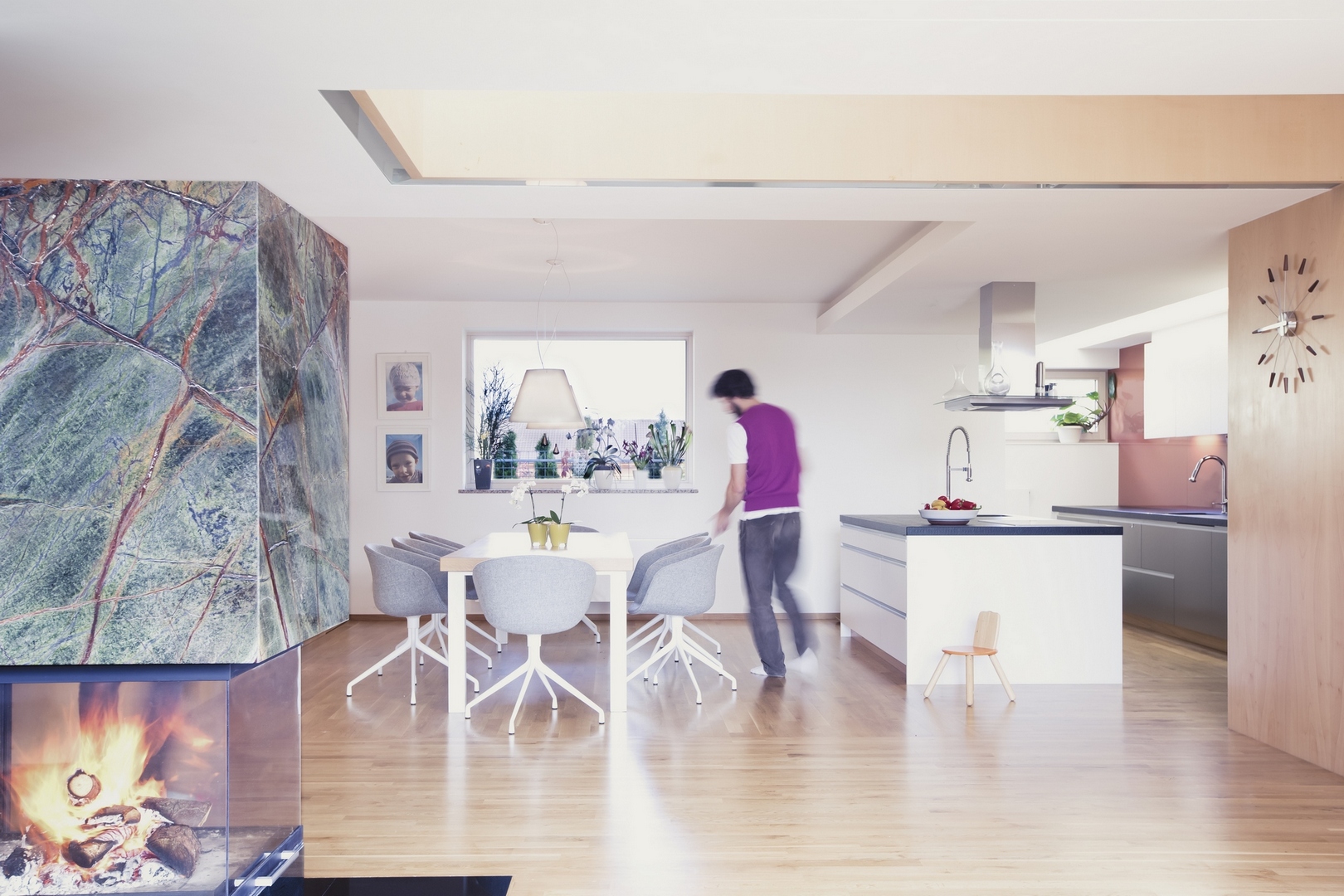 Dominantou spojitého prostoru obývacího pokoje s kuchyní a jídelnou je prostorový krb, obložený výrazným kamenem a předělovou skříní s televizí, která je na objekt krbu napojena. Zde se odehrává většina společného času rodiny v domě, prostor je prosvětlený ze výškově členeným stropem. Důraz byl kladen na různé typy osvětlení prostoru pro navození rozdílných atmosfér při užívání. Akustickou pohodu prostoru řeší textilně obložené posuvné dveře vestavěné knihovny a závěsy na oknech. Podlahy v přízemí jsou převážně z dubových parket ošetřených voskem, v patře jsou použity podlahy z výrazně barevného přírodního linolea. Propojovacím prvkem interiéru je práce s vertikálními dýhovanými obklady stěn oddělující v přízemí apartmán rodičů a v patře dětský pokoj, stejná topolová dýha je použita na zábradlí a obkladu v jídelně, který navazuje na schodiště.