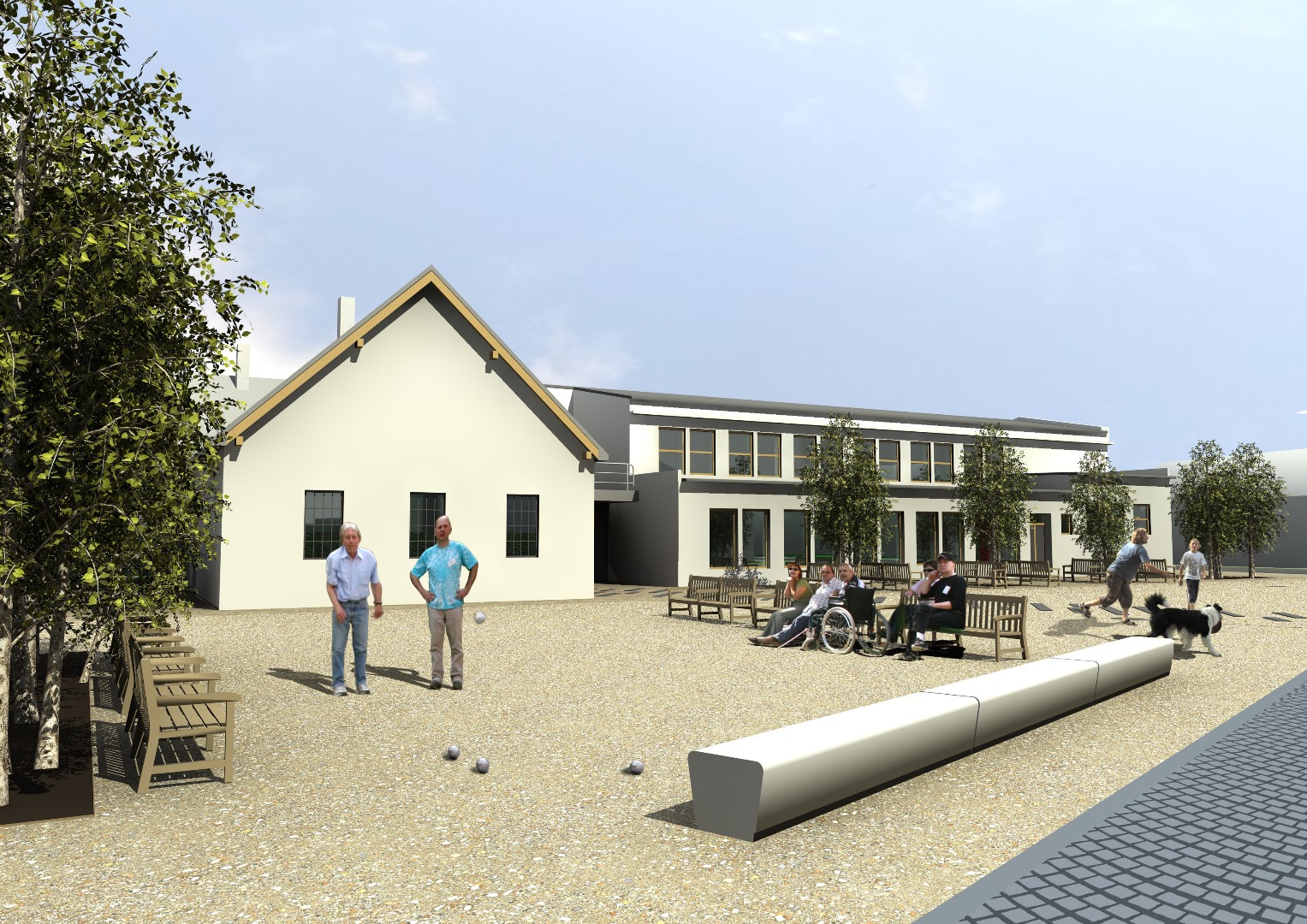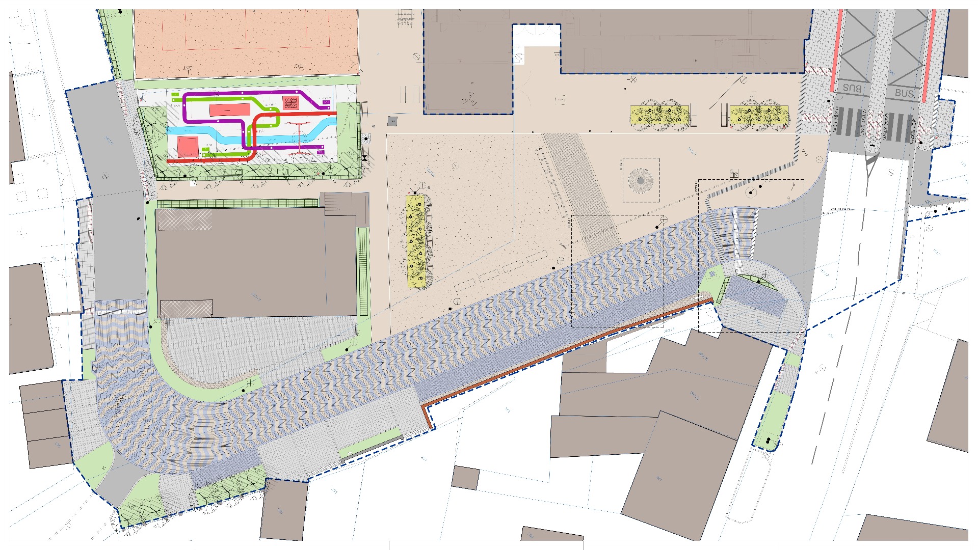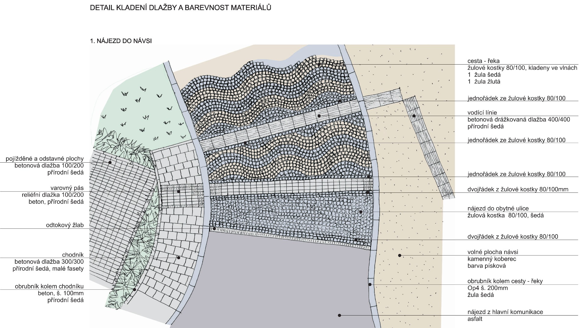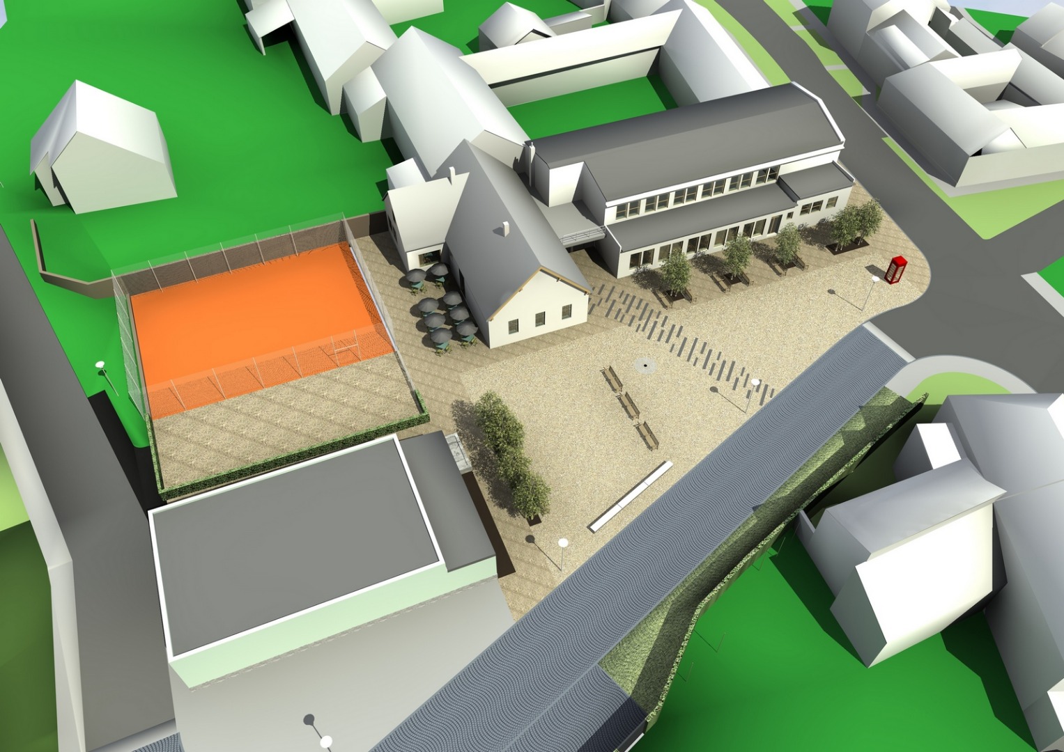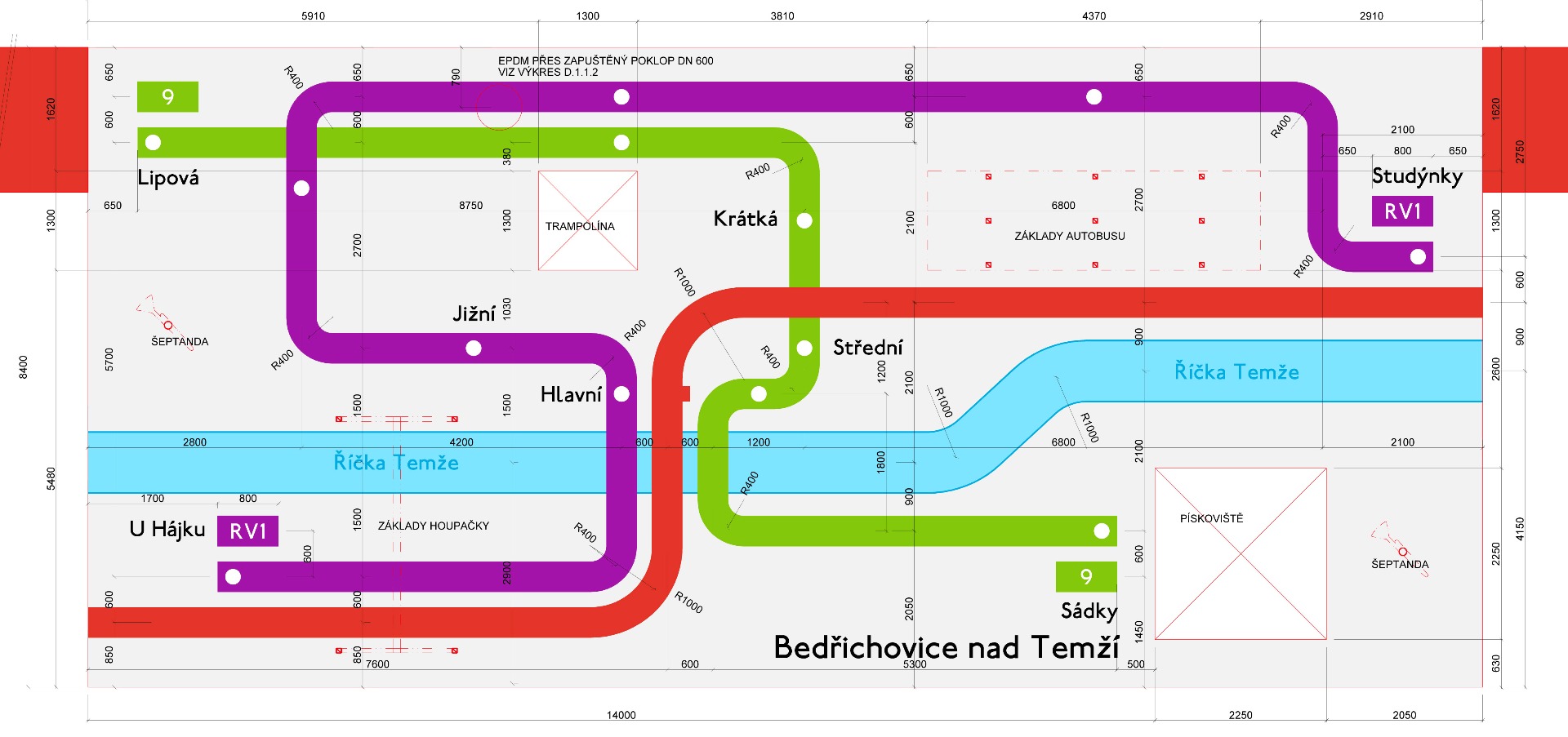 Hlavním úkolem architektů se stalo propojení londýnské akce s architekturou, tedy vytvoření nového veřejného prostoru, který má sloužit ke společenským a kulturním událostem tak, aby byla zachována atmosféra a nadhled celého výletu, přenesené prvky nebyly samoúčelné a reagovali na daný prostor a jeho specifika. Novým urbanistickým řešením návsi, spočívající v přeložení komunikace a vytvoření většího předprostoru před kulturním domem, se do Bedřichovic přeneseně dostala i řeka Temže, na které denně pluje několik desítek velkých trajektů a lodí. V Bedřichovicích je tato komunikace určena pro dopravní vozidla, jen modrošedá dlažba kladena do vln evokuje šířku a tok řeky. Shodou okolností vede přeložená komunikace souběžně se zatruběným potokem. Temže se tak pomyslně potkává s Bedřichovickým potůčkem.