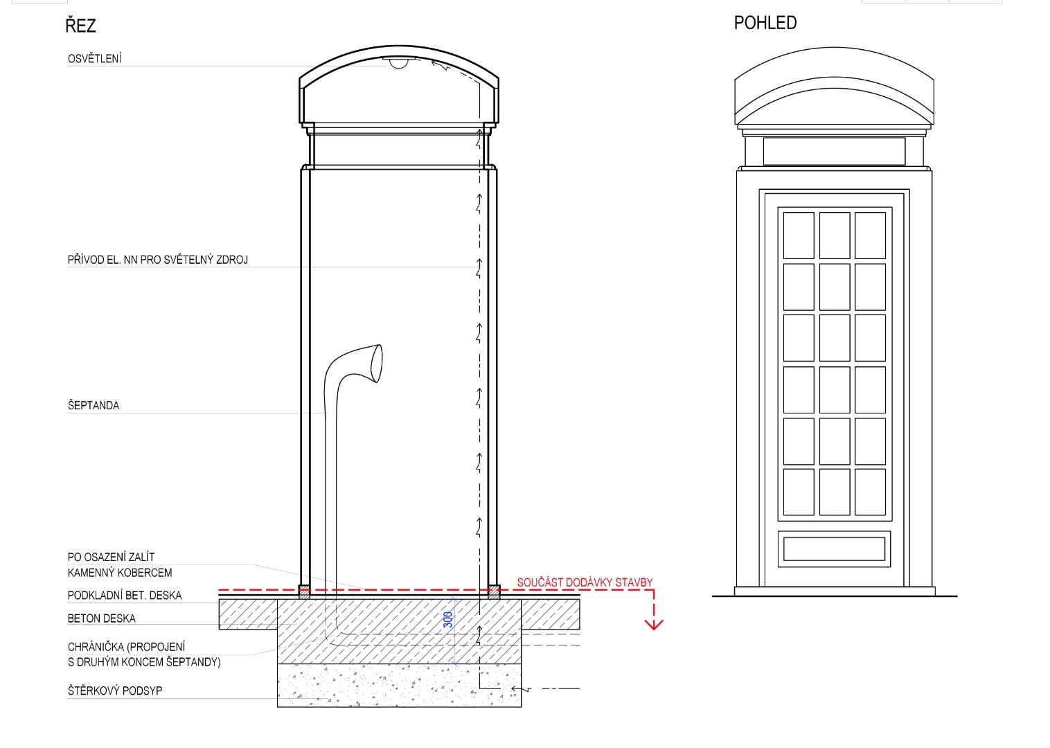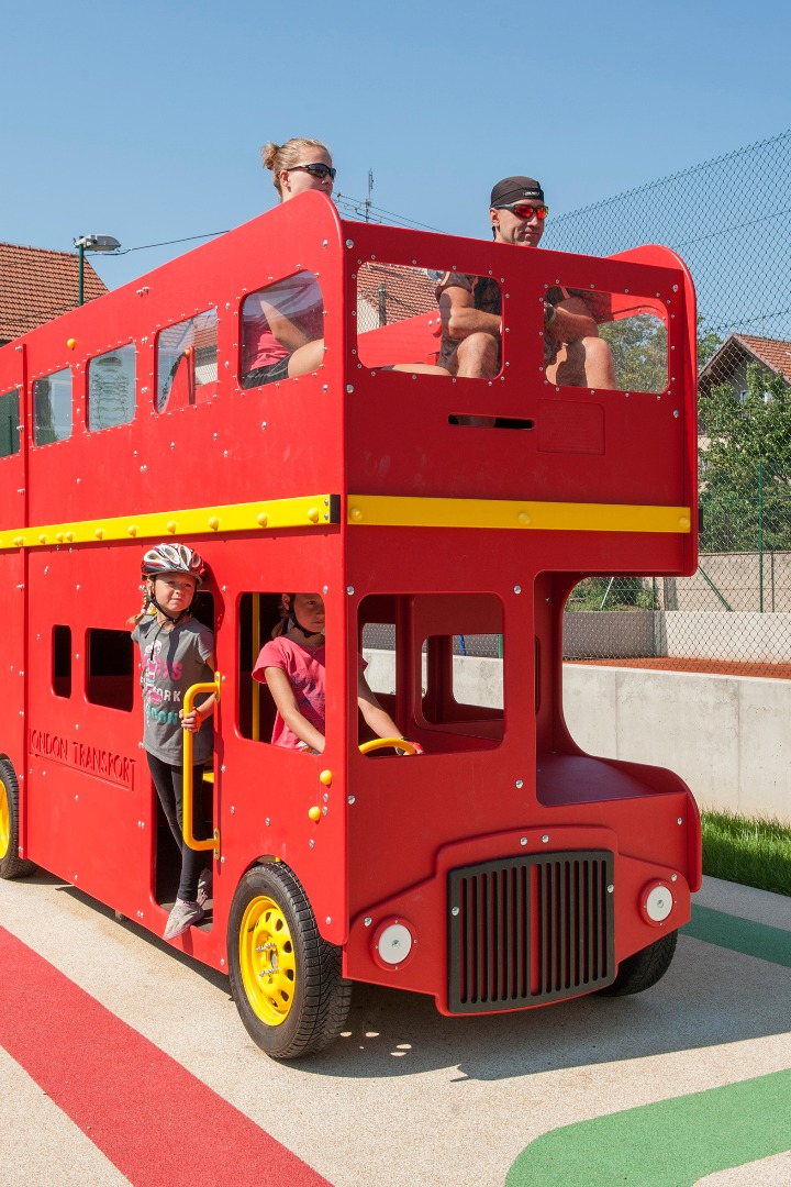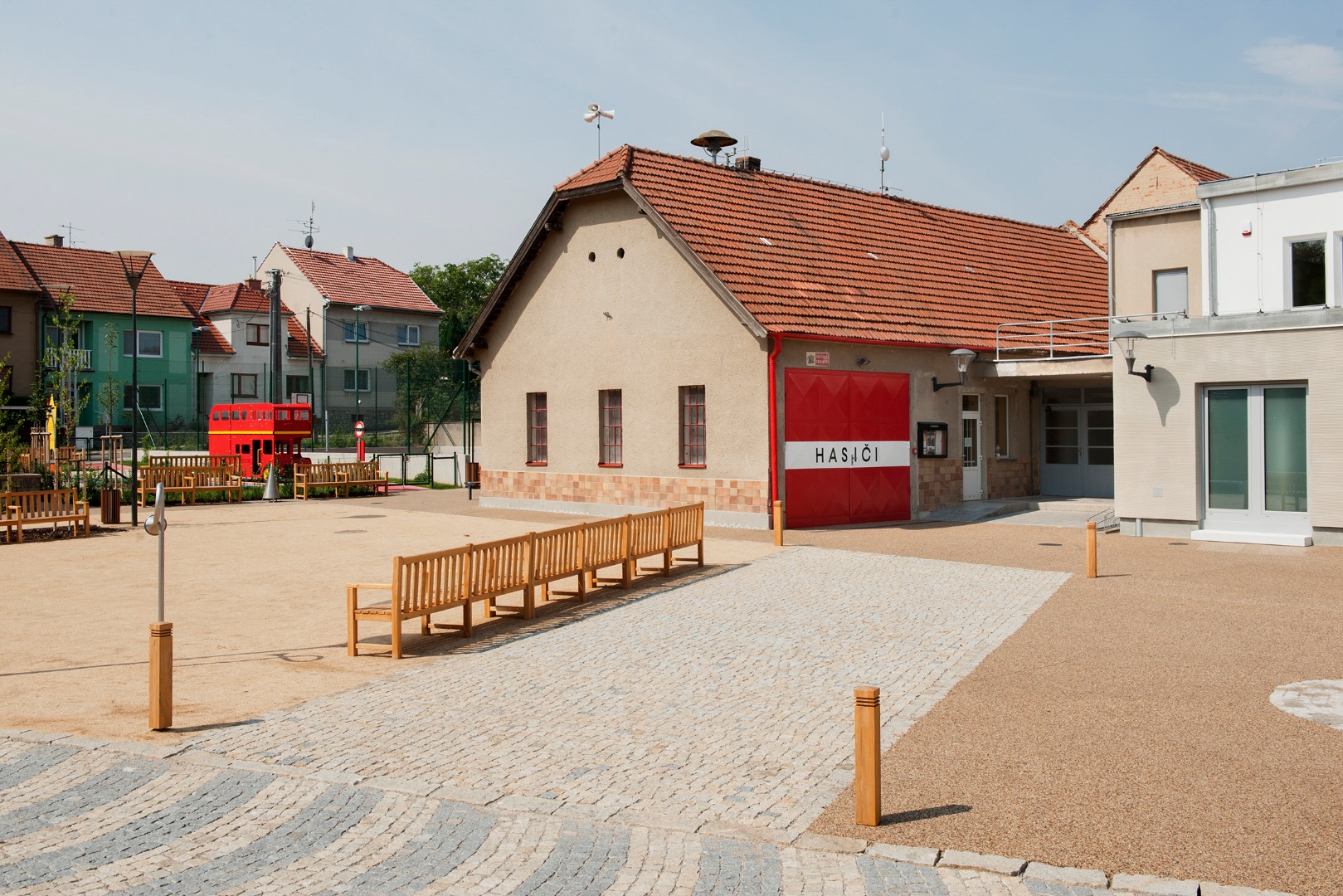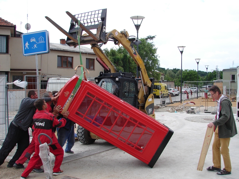 Na náves se dostala i tradiční červená telefonní budka, v níž je hra šeptanda, a vy si můžete zavolat z Bedřichovic přímo do Londýna. Na dětském hřišti byl postaven dětský doubledecker s trasou londýnského metra, červené prvky doplňují hasičské vrata ve stejné barvě. Kromě prvků vycházejících z britské tradice se inspiračním zdrojem stal i prostor, kde akce „Od nevidím do nevidím“ probíhala, tedy předprostor galerie Tate Modern. Z těchto míst se do Bedřichovic dostala povrchová úprava návsi, který je narušen vzrostlými břízami. Kamenný koberec na betonovém podkladu vytváří komunikační plochu návsi, lemuje budovu a pokrývá přední část směrem k hlavní cestě. Rozšířené místo před budovou bývalé samoobsluhy má povrch z pískového mlatu. Tato plocha je pouze pro pěší, je to herní prostor návsi. Podélná lavice vymezuje, zastavuje hrací prostor od komunikace. Výběrem ryze městských prvků a jejich aplikování na prostředí vesnice zároveň dochází k symbolickému gestu, které komunikuje s obyvateli obce, jež sami dojíždějí každý den do města za prací nebo do škol.