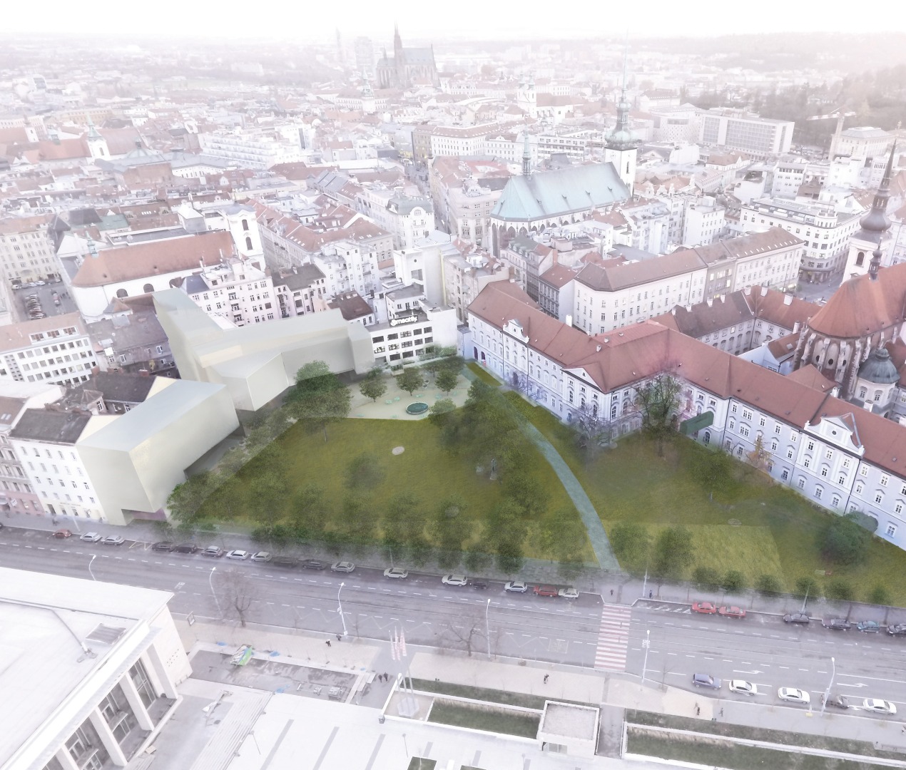 Samotné místo už nepotřebuje žádnou výraznou dominantu, dominantou je hmota místodržitelského paláce, kláštera, který v historii vybočoval z hlavního opevnění středu města. Tato jeho pozice je i dnes stále patrná. Návrh z toho vychází a okolí paláce „čistí“ tak aby při objíždění centra města byl palác viditelnou dominantou a orientačním bodem.