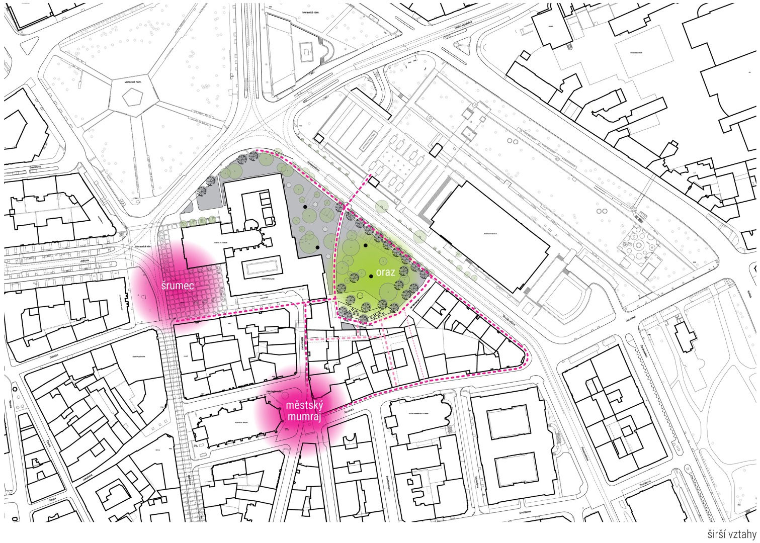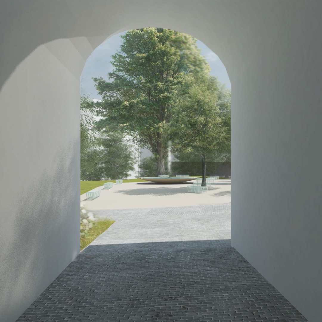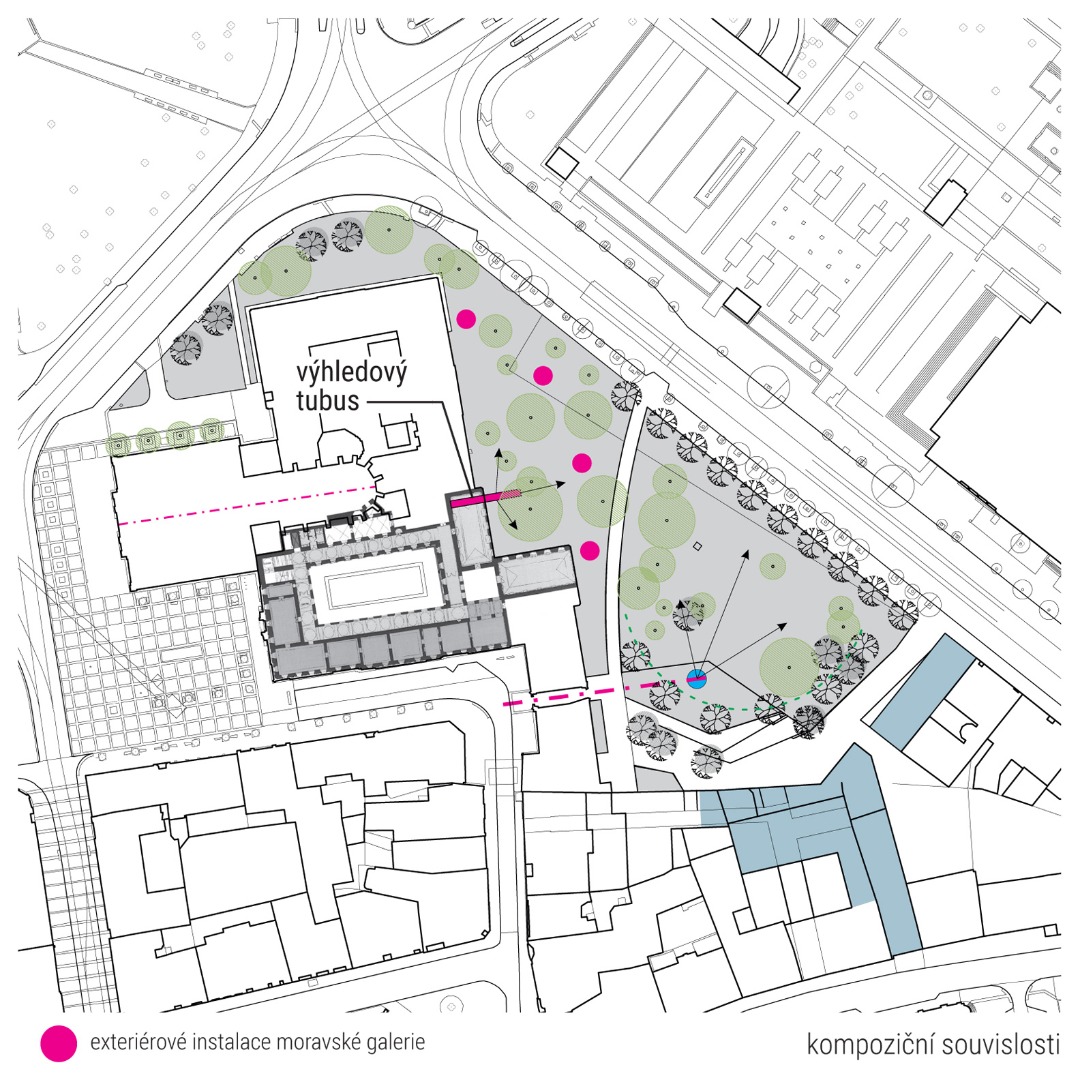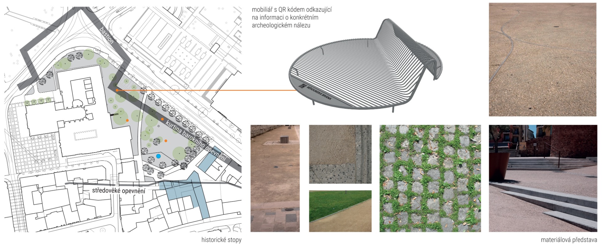 Pracujeme s pocitem být vně, případně být mezi, který je pro toto místo z historie charakteristický. Být vně centra, projít průchodem a ze shonu a vřavy být na chvíli v klidu, spočinout s výhledem do „městské krajiny za hradbami“.
