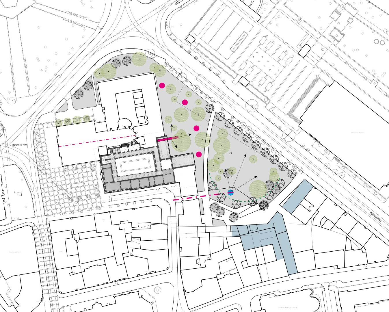 Vzniká tak propojení parkové, přírodní plochy se společenským centrem v okolí kostela Sv. Jakuba, na ul. Běhounská a na Moravském náměstí.