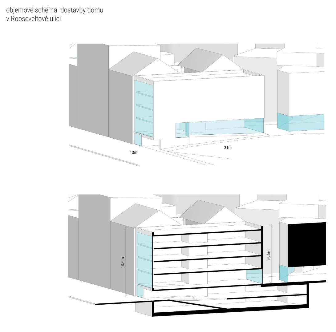 Dostavba na ulici Roosveltova, ukončuje uliční frontu a integruje ulici s parkem.